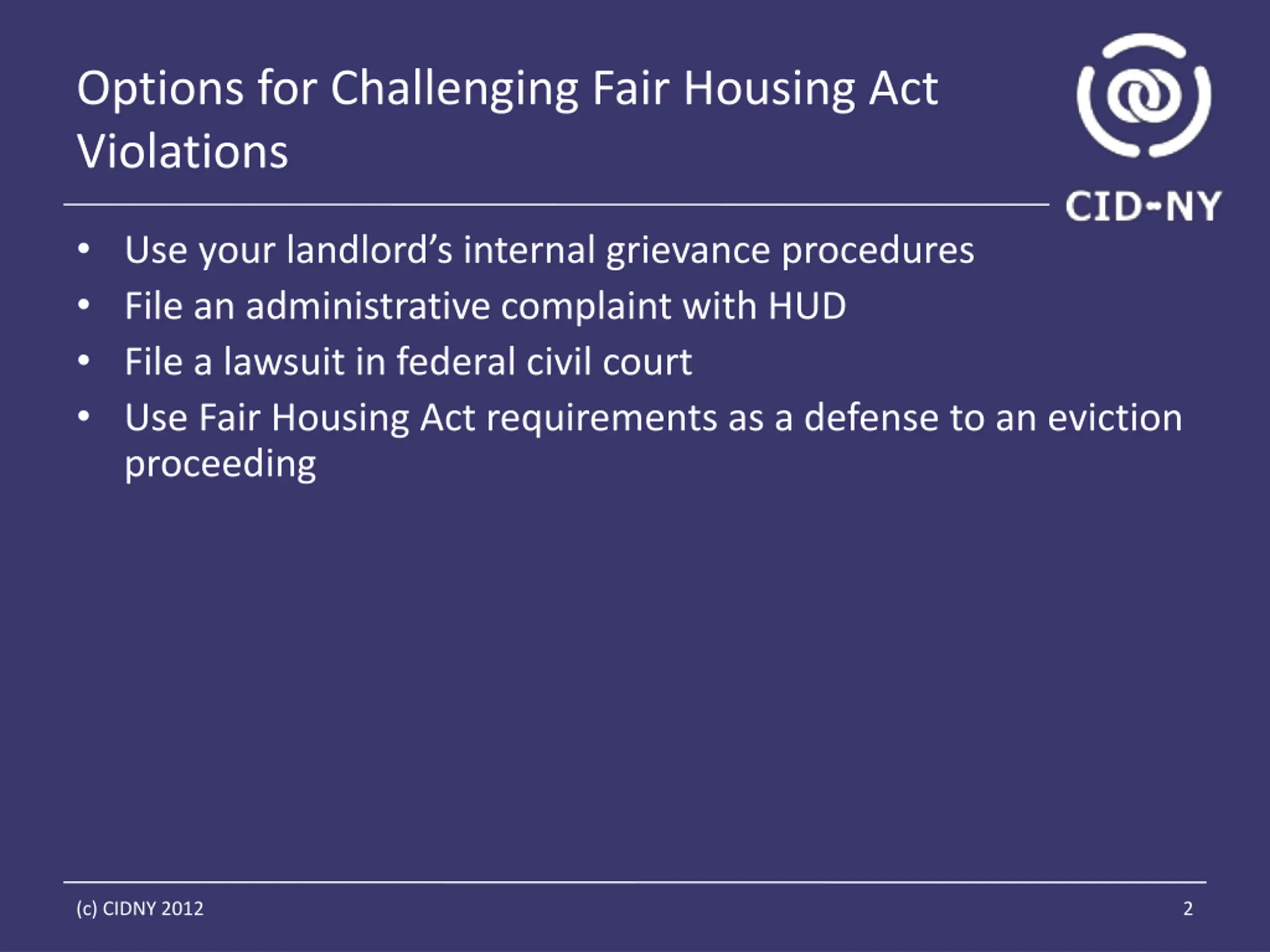 Options for Challenging Fair Housing Act Violations Use your landlord s internal grievance procedures File an administrative complaint with HUD File a lawsuit in federal civil court Use Fair Housing Act requirements as a defense to an eviction proceeding (c) CIDNY 2012 2