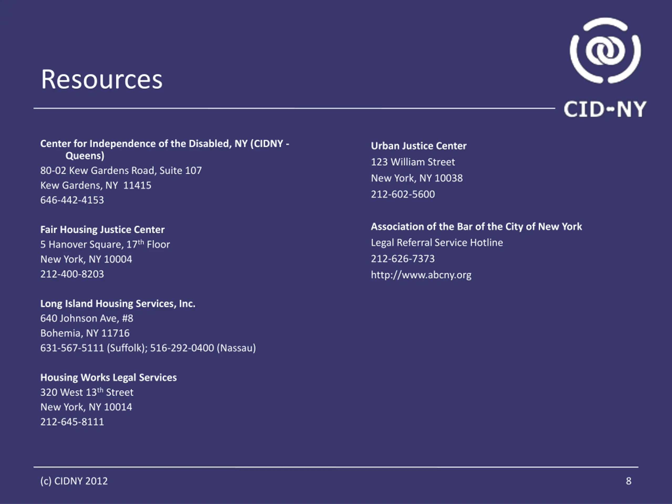 Resources Center for Independence of the Disabled, NY (CIDNY - Queens) 80-02 Kew Gardens Road, Suite 107 Kew Gardens, NY 11415 646-442-4153 Urban Justice Center 123 William Street New York, NY 10038 212-602-5600 Association of the Bar of the City of New York Legal Referral Service Hotline 212-626-7373 http://www.abcny.org Fair Housing Justice Center 5 Hanover Square, 17th Floor New York, NY 10004 212-400-8203 Long Island Housing Services, Inc. 640 Johnson Ave, #8 Bohemia, NY 11716 631-567-5111 (Suffolk); 516-292-0400 (Nassau) Housing Works Legal Services 320 West 13th Street New York, NY 10014 212-645-8111 (c) CIDNY 2012 8