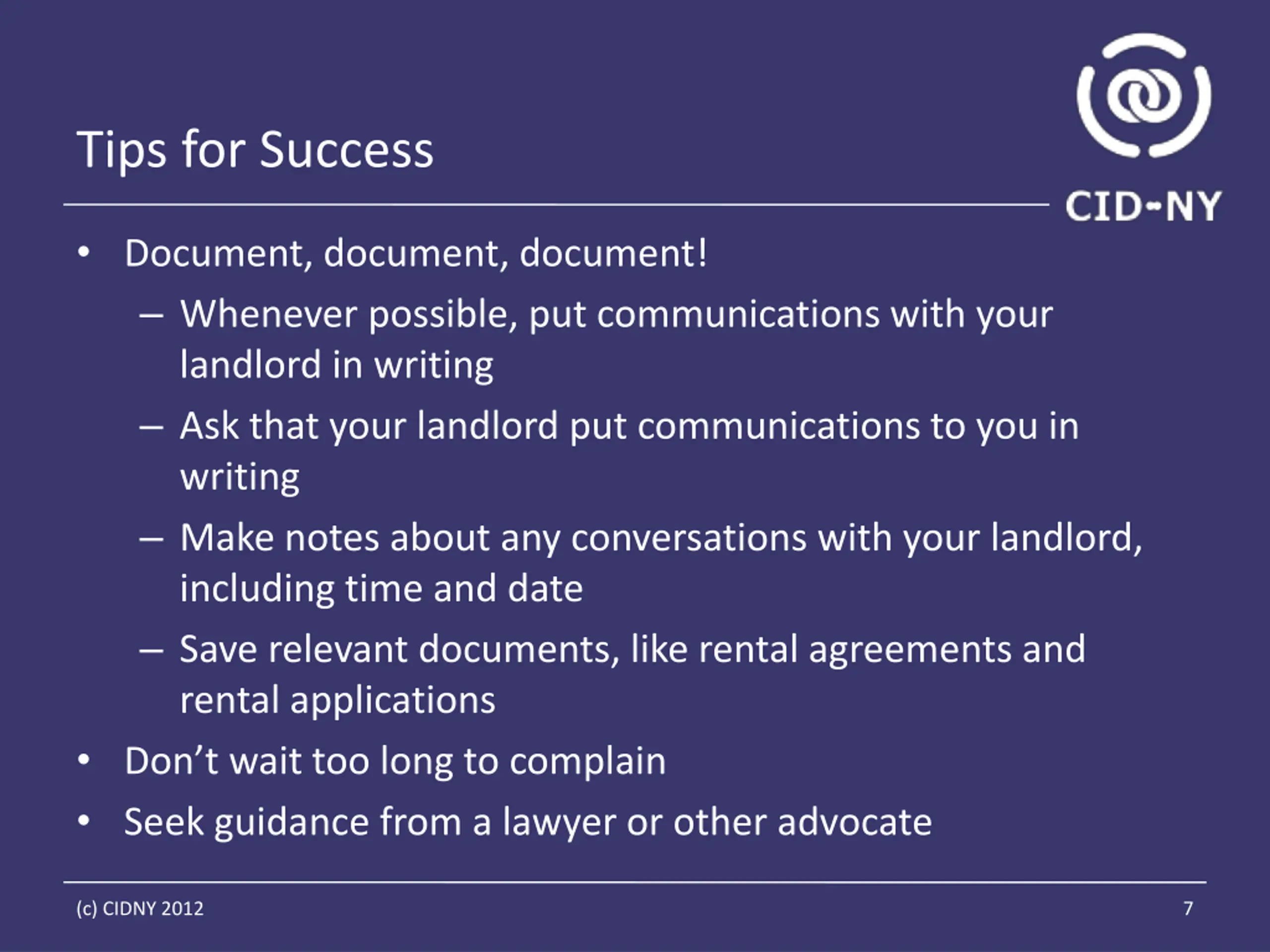 Tips for Success Document, document, document! Whenever possible, put communications with your landlord in writing Ask that your landlord put communications to you in writing Make notes about any conversations with your landlord, including time and date Save relevant documents, like rental agreements and rental applications Don t wait too long to complain Seek guidance from a lawyer or other advocate (c) CIDNY 2012 7