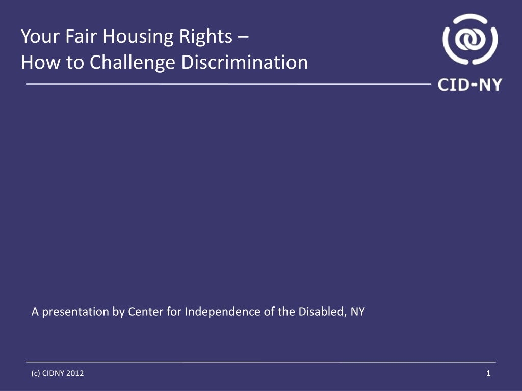 Your Fair Housing Rights How to Challenge Discrimination A presentation by Center for Independence of the Disabled, NY (c) CIDNY 2012 1 1
