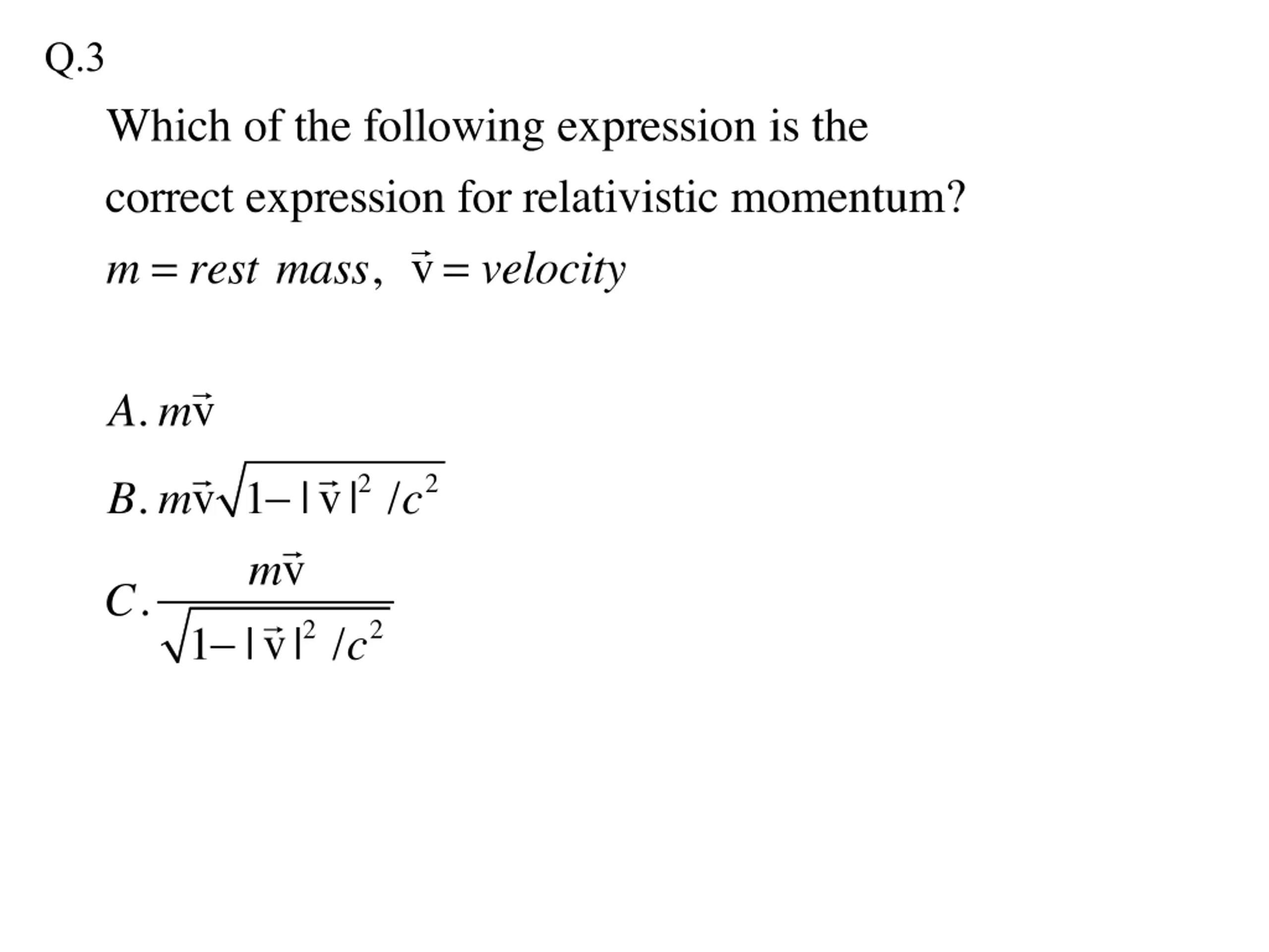Q.2 A super fast train is travelling at 0.6c relative to the station toward the positive x-direction. The train has a proper length of 600 m. At the moment the front of the train reaches the station sign (event 1), the driver sends a light signal to the back of the train. Event 2 is when the light reaches the back of the train. Set up the coordinate system such that event 1 in the train s reference frame is (x =0, t =0). Describe event 2 in the train s frame of reference. Given: Speed of light = 3x108 m/s. A. (x = - 600 m, t =0) B. (x = -600 m, t =2 s) C. (x = -480 m, t =2 s) D. (x = -750m, t =2 s)