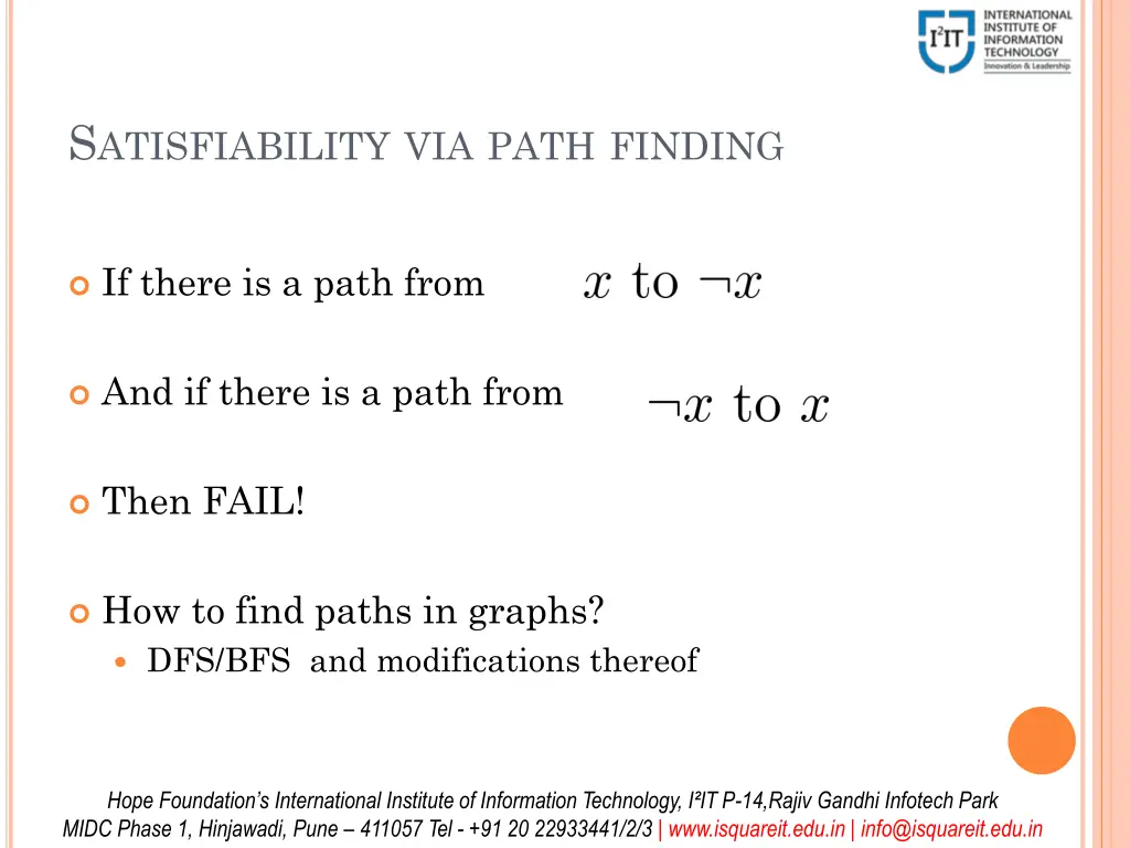 SATISFIABILITYVIAPATHFINDING If there is a path from And if there is a path from Then FAIL! How to find paths in graphs? DFS/BFS and modifications thereof Hope Foundation s International Institute of Information Technology, I IT P-14,Rajiv Gandhi Infotech Park MIDC Phase 1, Hinjawadi, Pune 411057 Tel - +91 20 22933441/2/3 | www.isquareit.edu.in | info@isquareit.edu.in