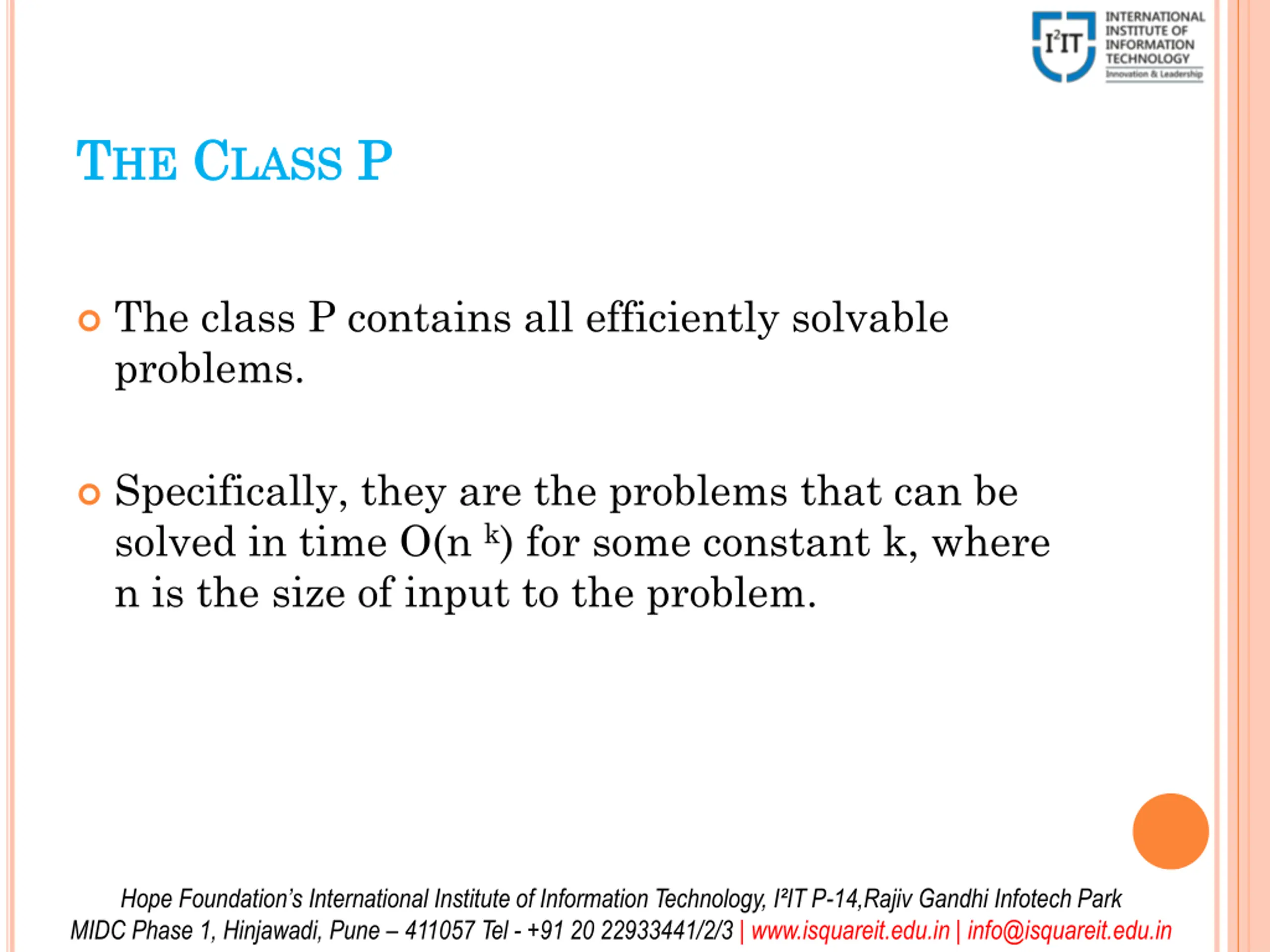 T THE HE C CLASS LASS P P The class P contains all efficiently solvable problems. Specifically, they are the problems that can be solved in time O(n k) for some constant k, where n is the size of input to the problem. Hope Foundation s International Institute of Information Technology, I IT P-14,Rajiv Gandhi Infotech Park MIDC Phase 1, Hinjawadi, Pune 411057 Tel - +91 20 22933441/2/3 | www.isquareit.edu.in | info@isquareit.edu.in