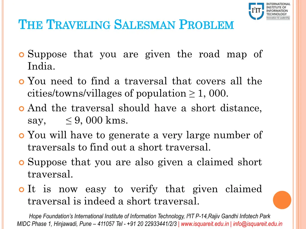 T THE HE T TRAVELING RAVELING S SALESMAN ALESMAN P PROBLEM ROBLEM Suppose that you are given the road map of India. You need to find a traversal that covers all the cities/towns/villages of population 1, 000. And the traversal should have a short distance, say, 9, 000 kms. You will have to generate a very large number of traversals to find out a short traversal. Suppose that you are also given a claimed short traversal. It is now easy to verify that given claimed traversal is indeed a short traversal. Hope Foundation s International Institute of Information Technology, I IT P-14,Rajiv Gandhi Infotech Park MIDC Phase 1, Hinjawadi, Pune 411057 Tel - +91 20 22933441/2/3 | www.isquareit.edu.in | info@isquareit.edu.in