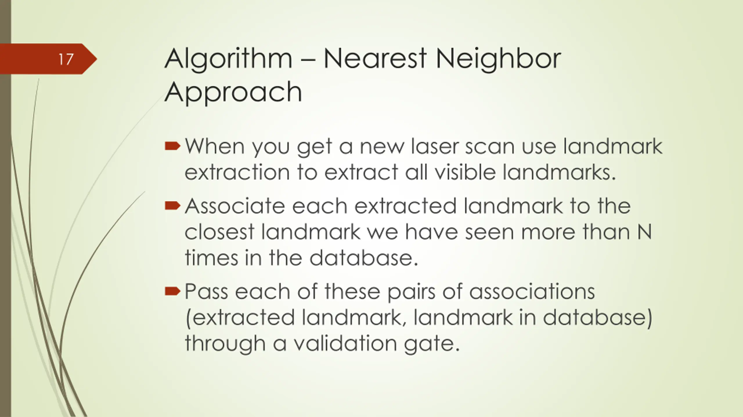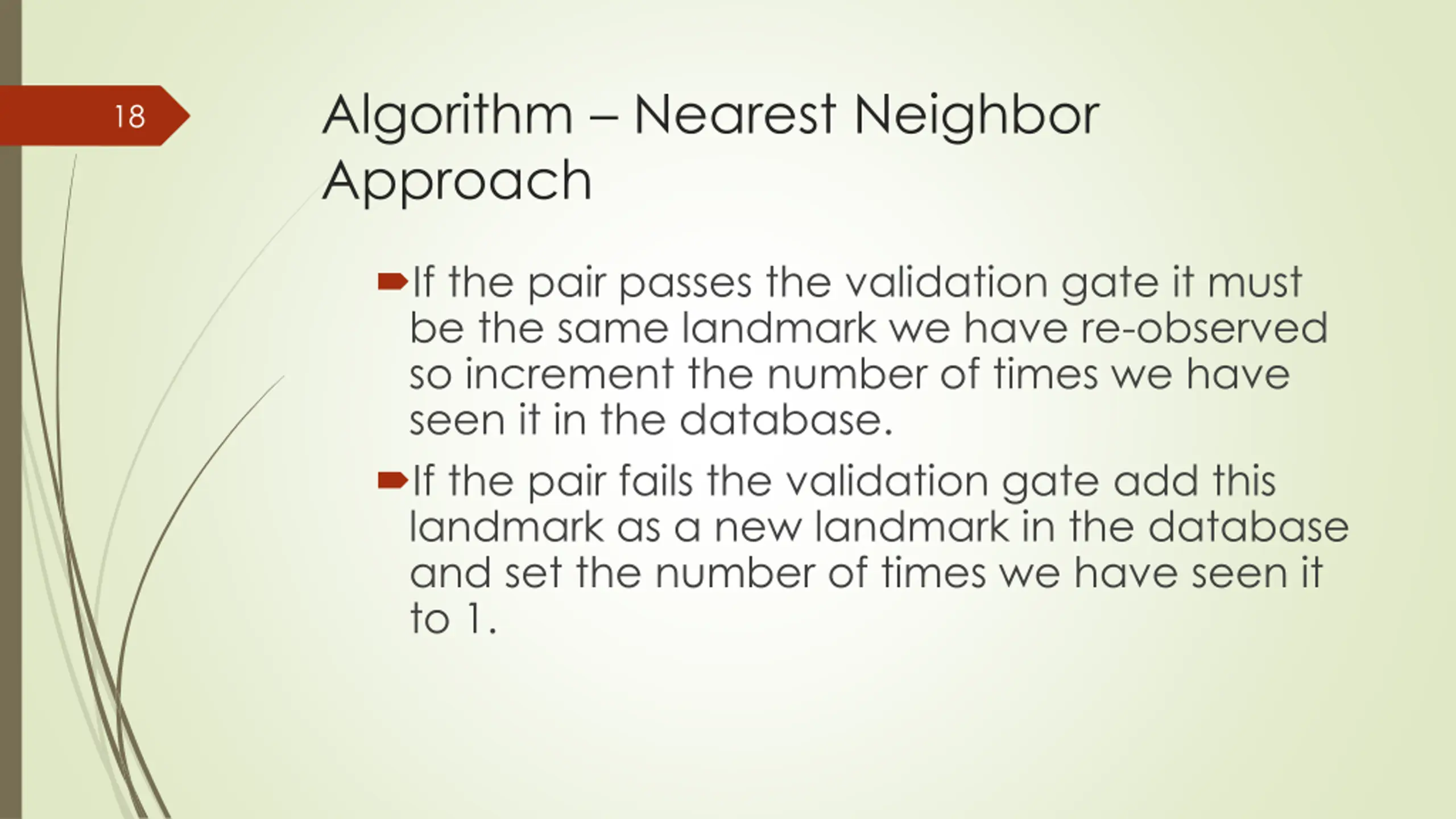 Algorithm Nearest Neighbor Approach 18 If the pair passes the validation gate it must be the same landmark we have re-observed so increment the number of times we have seen it in the database. If the pair fails the validation gate add this landmark as a new landmark in the database and set the number of times we have seen it to 1.