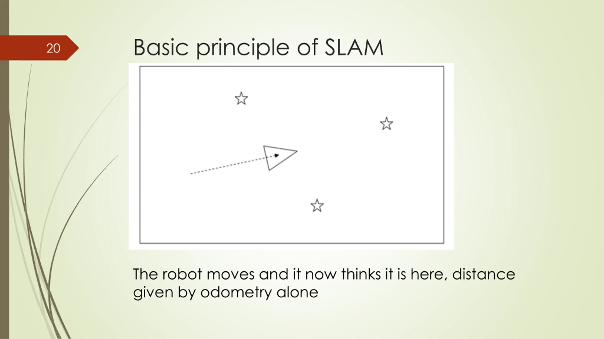 Basic principle of SLAM 20 The robot moves and it now thinks it is here, distance given by odometry alone