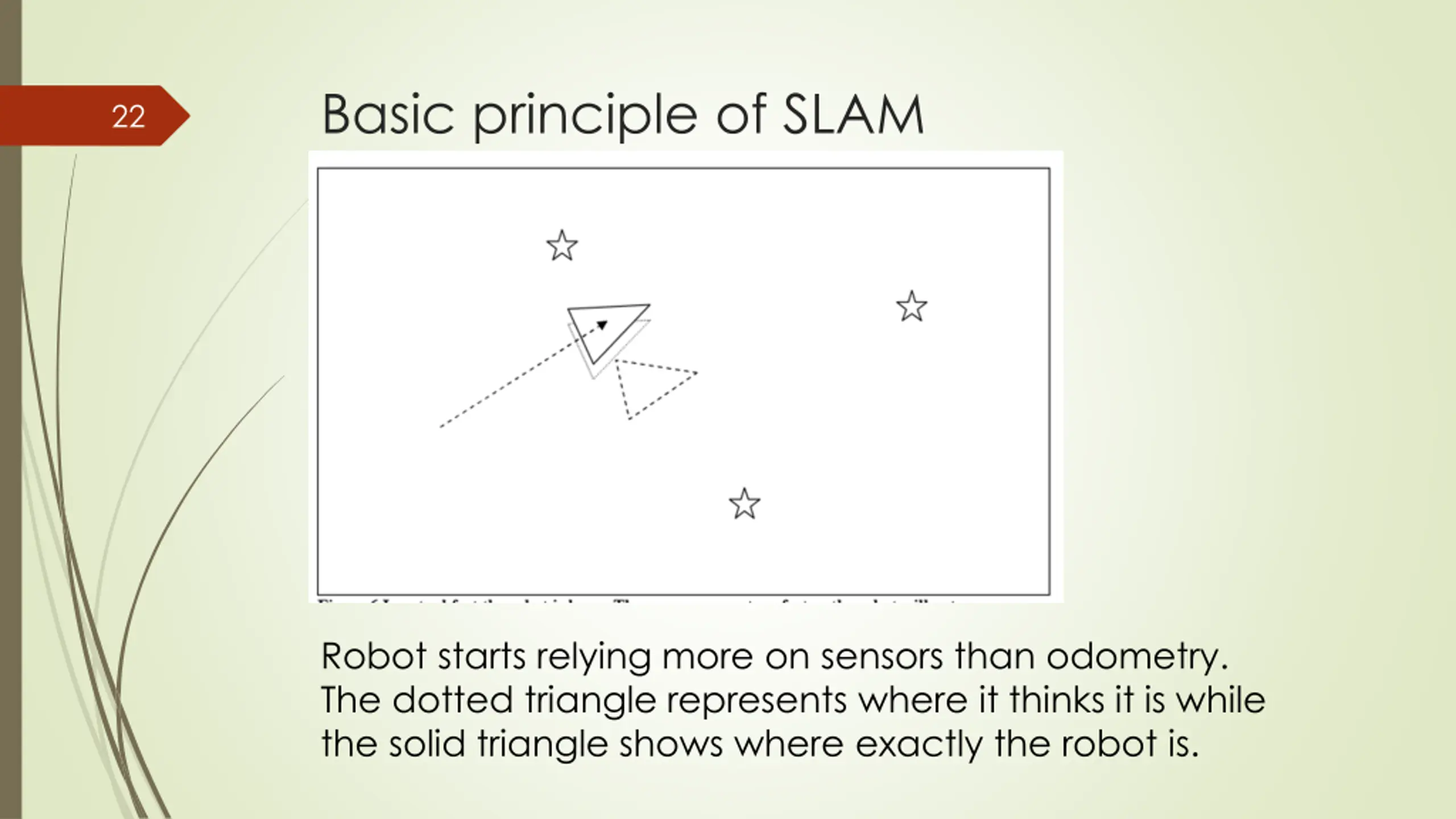 Basic principle of SLAM 22 Robot starts relying more on sensors than odometry. The dotted triangle represents where it thinks it is while the solid triangle shows where exactly the robot is.