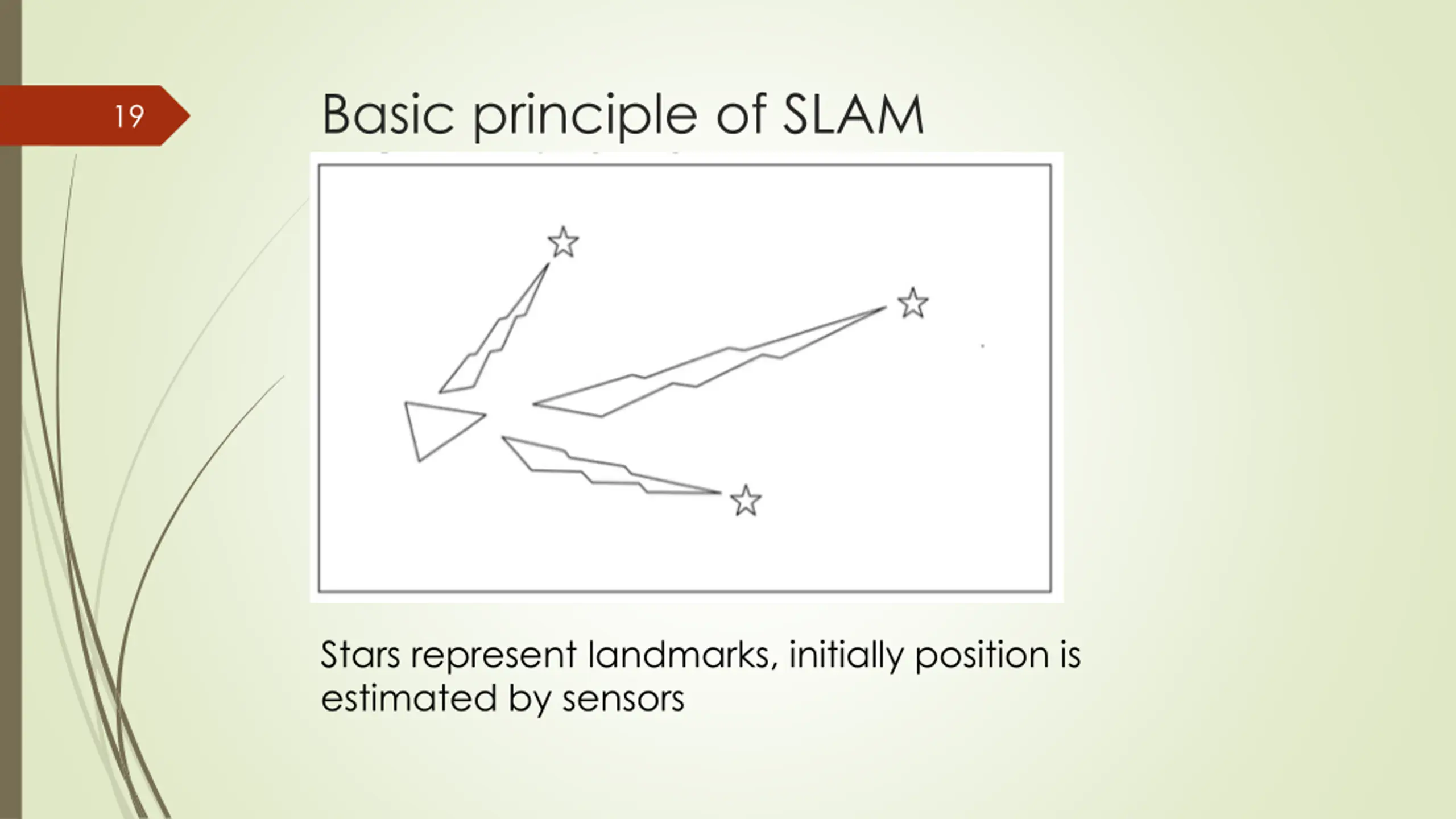 Basic principle of SLAM 19 Stars represent landmarks, initially position is estimated by sensors