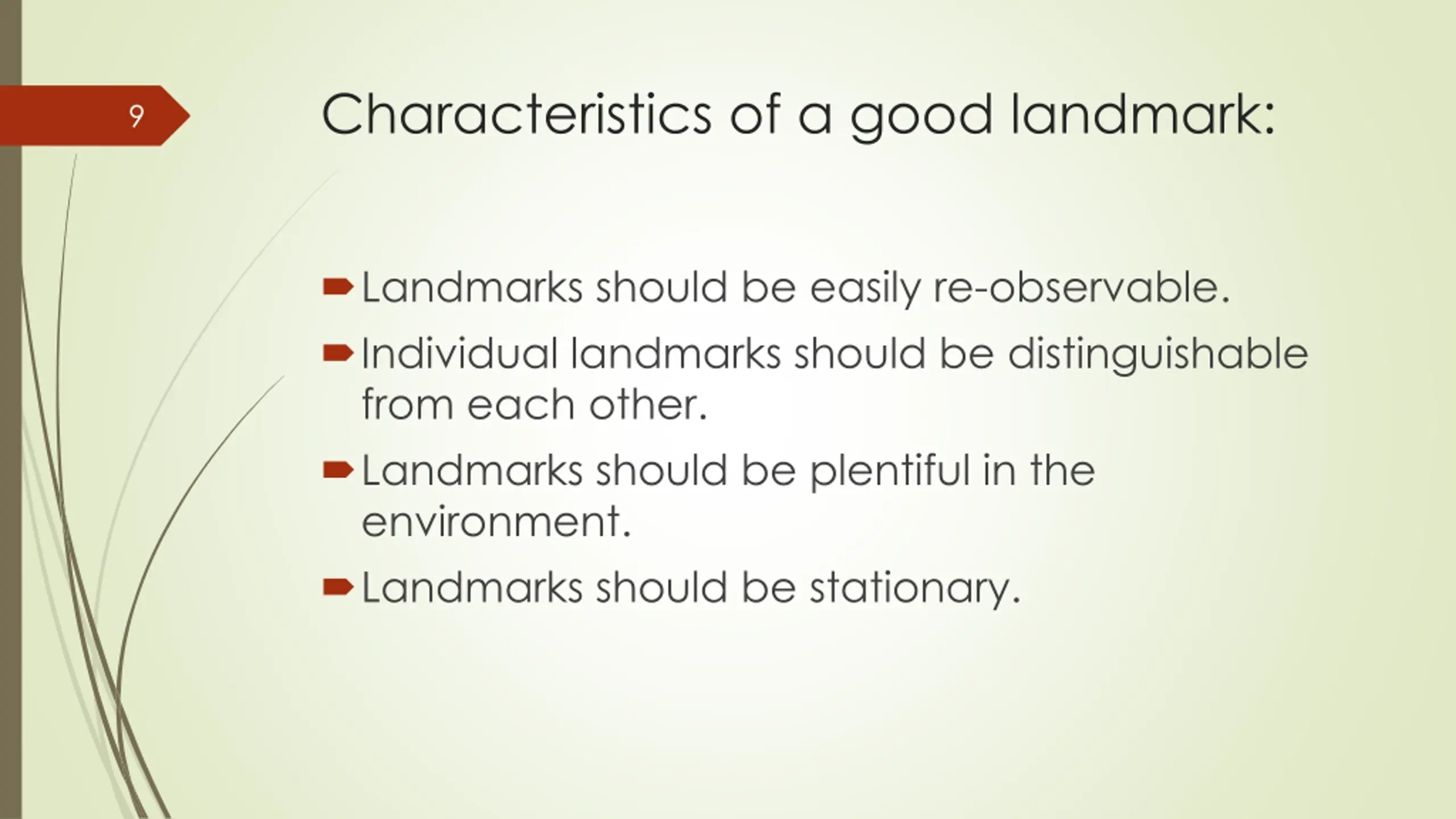 Characteristics of a good landmark: 9 Landmarks should be easily re-observable. Individual landmarks should be distinguishable from each other. Landmarks should be plentiful in the environment. Landmarks should be stationary.