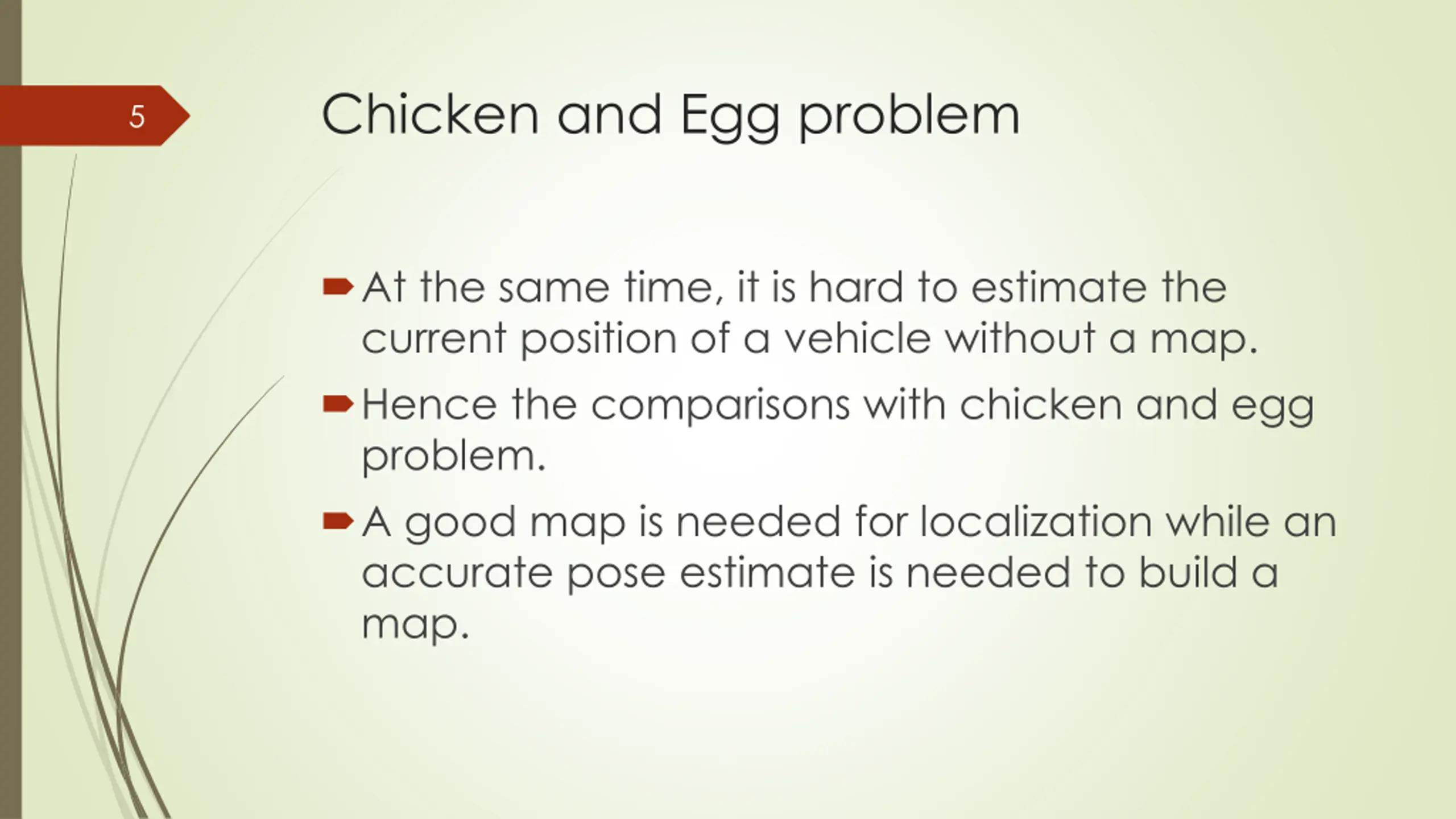 Chicken and Egg problem 5 At the same time, it is hard to estimate the current position of a vehicle without a map. Hence the comparisons with chicken and egg problem. A good map is needed for localization while an accurate pose estimate is needed to build a map.