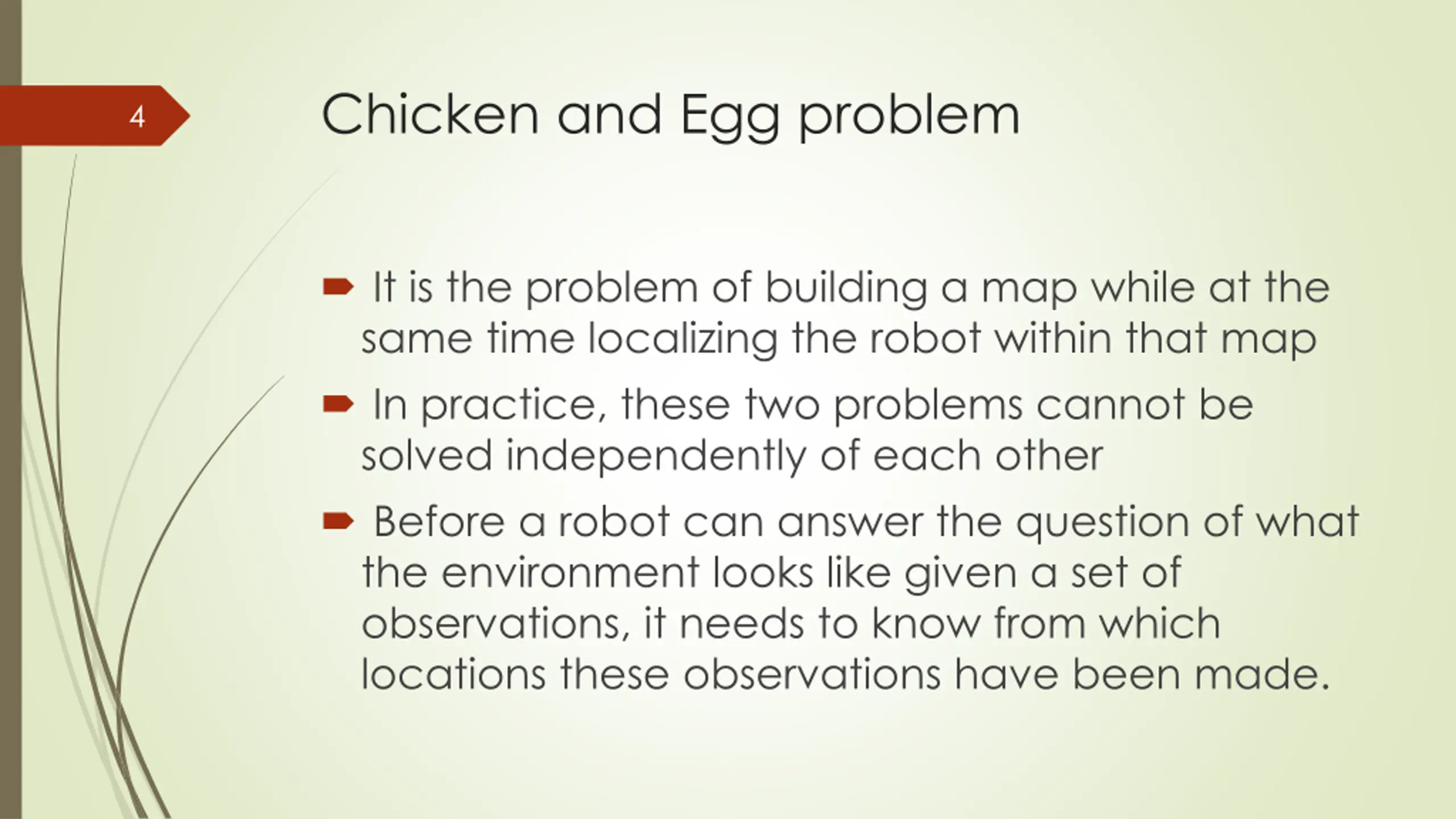 Chicken and Egg problem 4 It is the problem of building a map while at the same time localizing the robot within that map In practice, these two problems cannot be solved independently of each other Before a robot can answer the question of what the environment looks like given a set of observations, it needs to know from which locations these observations have been made.