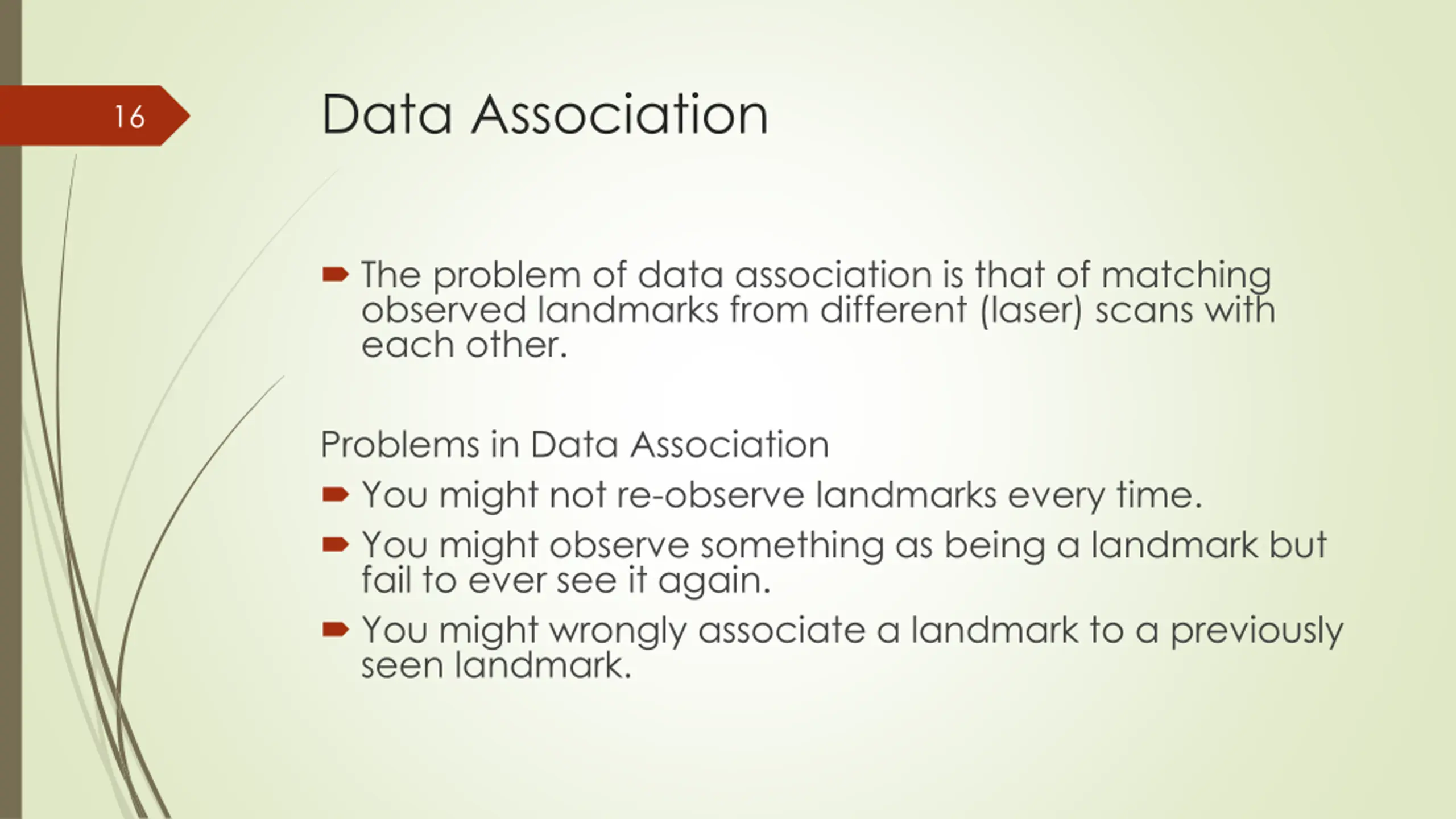 Data Association 16 The problem of data association is that of matching observed landmarks from different (laser) scans with each other. Problems in Data Association You might not re-observe landmarks every time. You might observe something as being a landmark but fail to ever see it again. You might wrongly associate a landmark to a previously seen landmark.