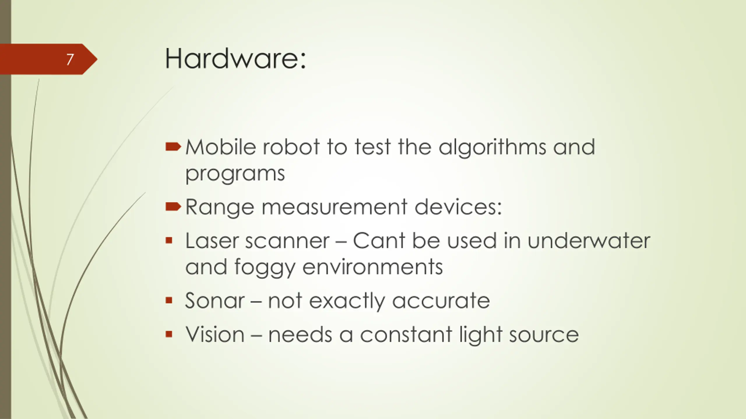 Hardware: 7 Mobile robot to test the algorithms and programs Range measurement devices: Laser scanner Cant be used in underwater and foggy environments Sonar not exactly accurate Vision needs a constant light source