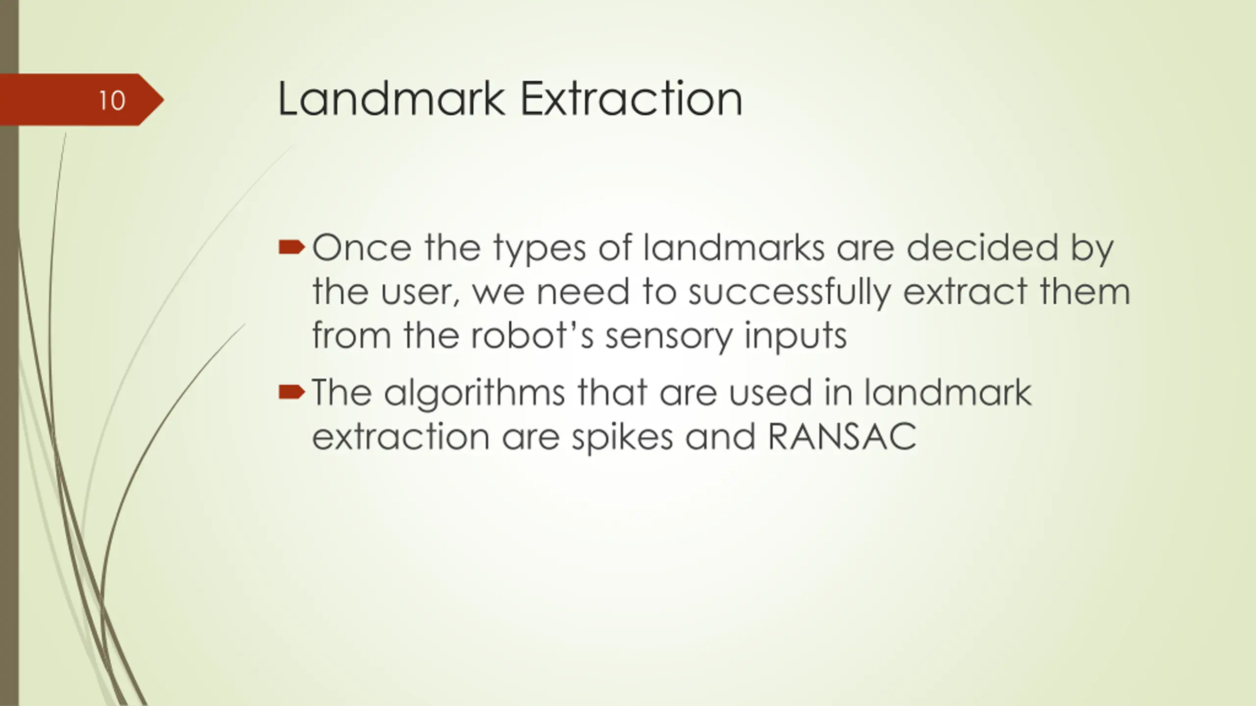 Landmark Extraction 10 Once the types of landmarks are decided by the user, we need to successfully extract them from the robot s sensory inputs The algorithms that are used in landmark extraction are spikes and RANSAC