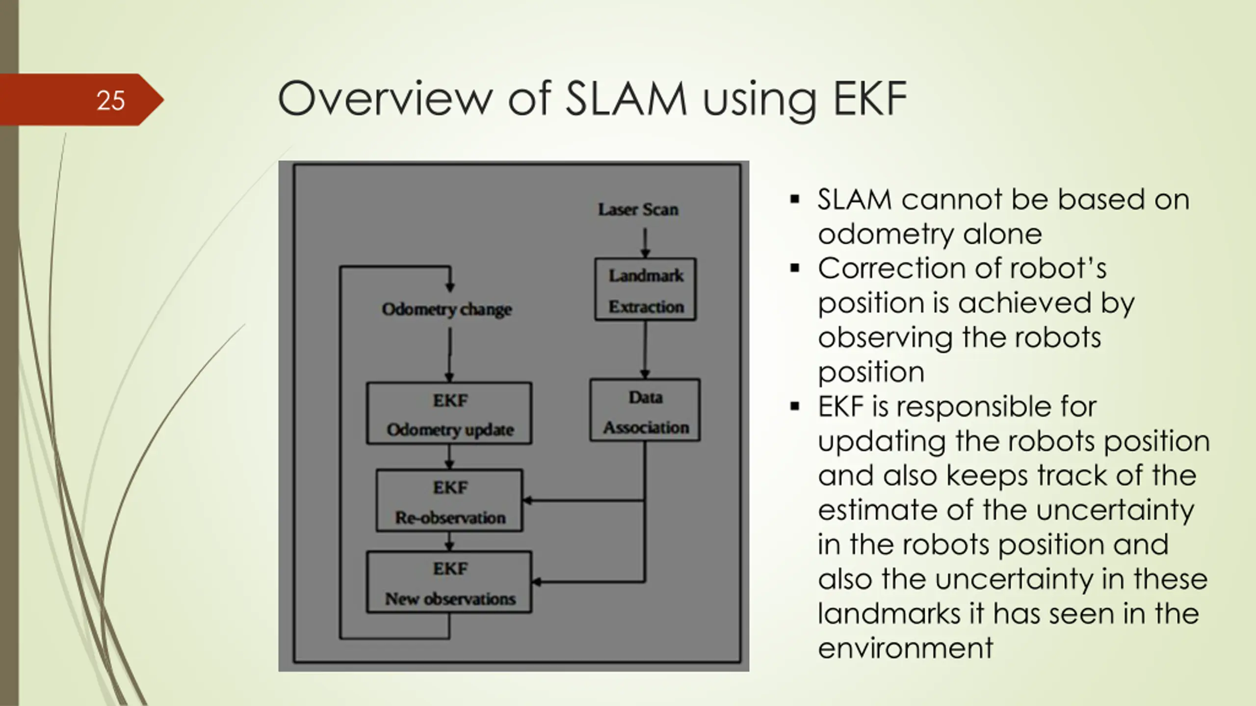 Overview of SLAM using EKF 25 SLAM cannot be based on odometry alone Correction of robot s position is achieved by observing the robots position EKF is responsible for updating the robots position and also keeps track of the estimate of the uncertainty in the robots position and also the uncertainty in these landmarks it has seen in the environment