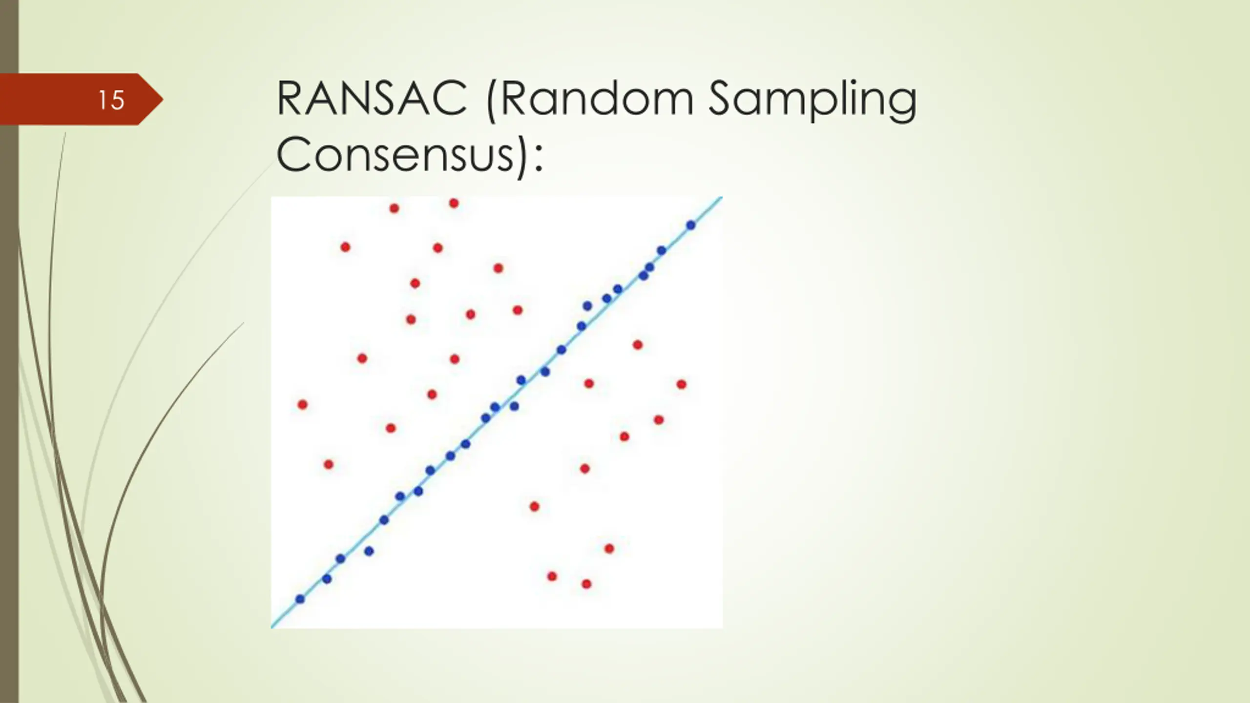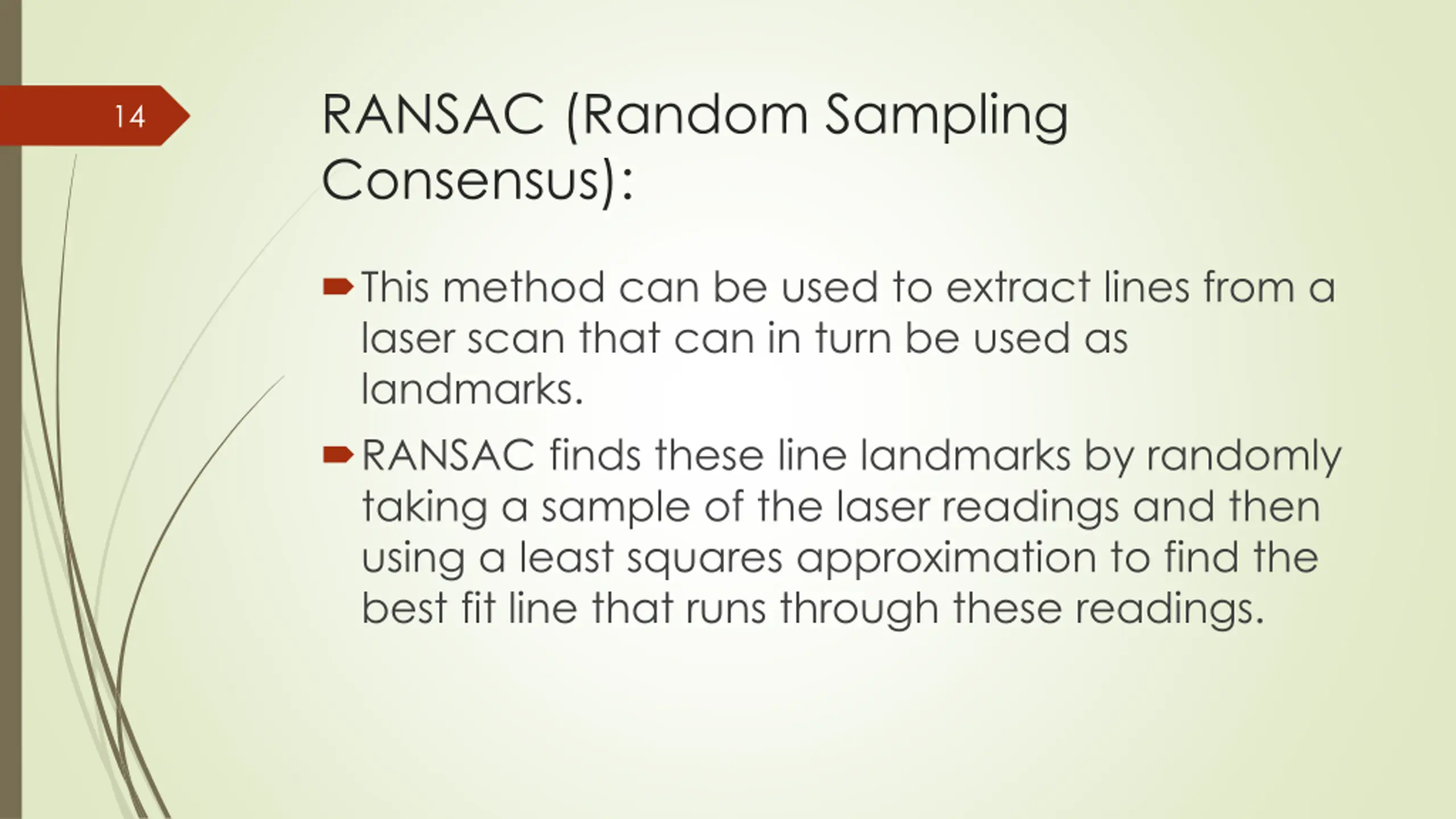 RANSAC (Random Sampling Consensus): 14 This method can be used to extract lines from a laser scan that can in turn be used as landmarks. RANSAC finds these line landmarks by randomly taking a sample of the laser readings and then using a least squares approximation to find the best fit line that runs through these readings.
