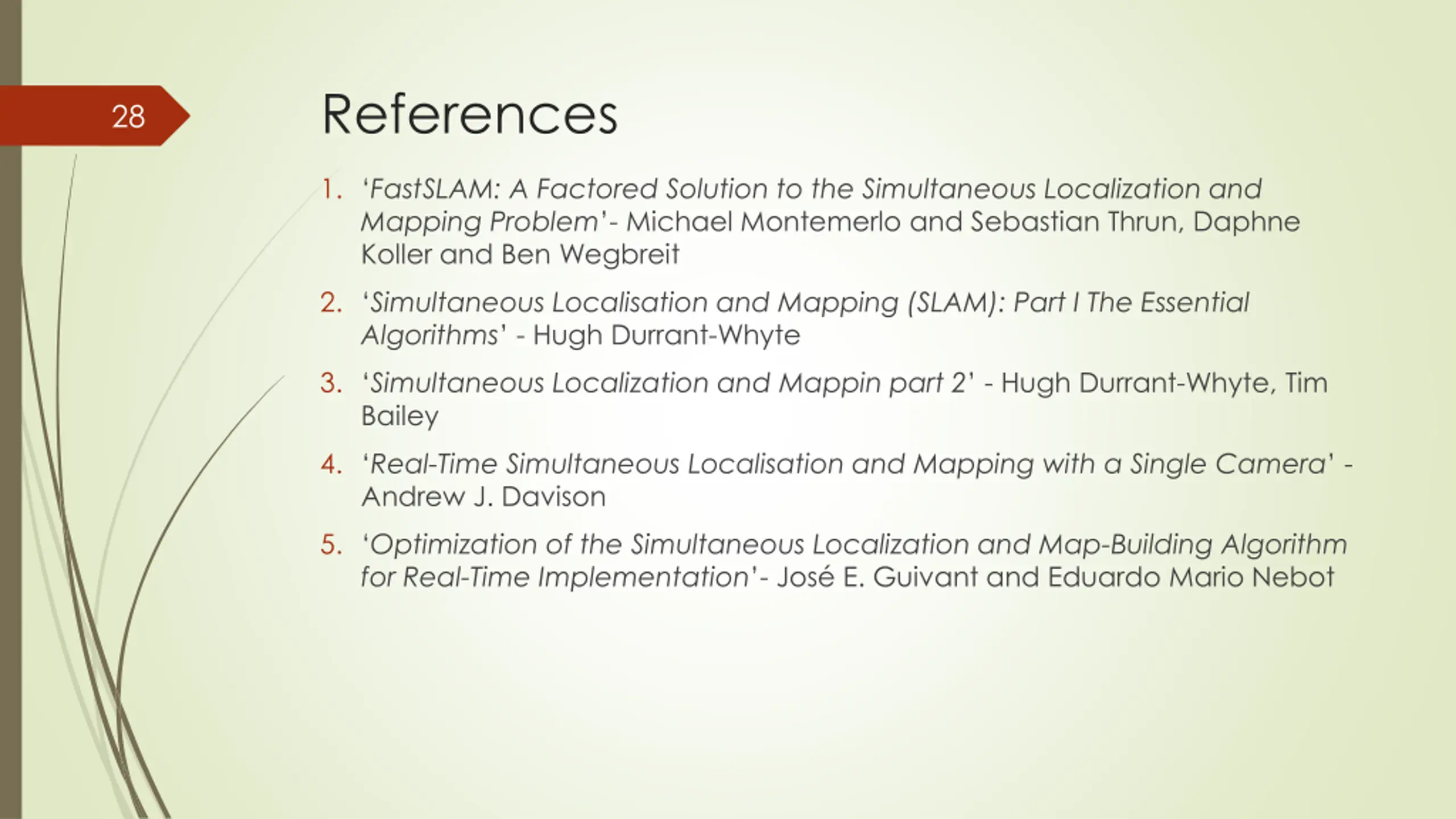 References 28 1. FastSLAM: A Factored Solution to the Simultaneous Localization and Mapping Problem - Michael Montemerlo and Sebastian Thrun, Daphne Koller and Ben Wegbreit 2. Simultaneous Localisation and Mapping (SLAM): Part I The Essential Algorithms - Hugh Durrant-Whyte 3. Simultaneous Localization and Mappin part 2 - Hugh Durrant-Whyte, Tim Bailey 4. Real-Time Simultaneous Localisation and Mapping with a Single Camera - Andrew J. Davison 5. Optimization of the Simultaneous Localization and Map-Building Algorithm for Real-Time Implementation - Jos E. Guivant and Eduardo Mario Nebot