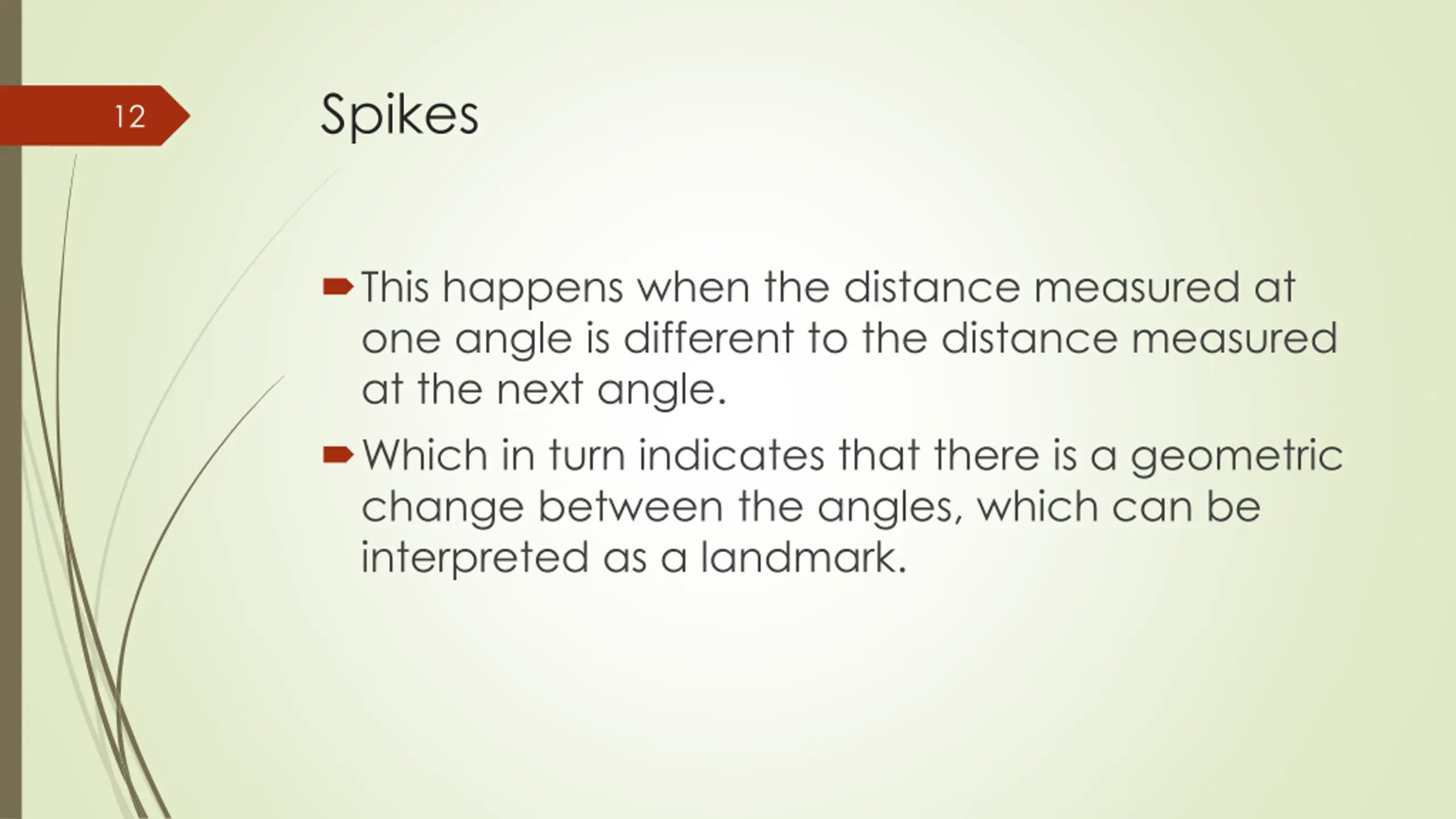 Spikes 12 This happens when the distance measured at one angle is different to the distance measured at the next angle. Which in turn indicates that there is a geometric change between the angles, which can be interpreted as a landmark.