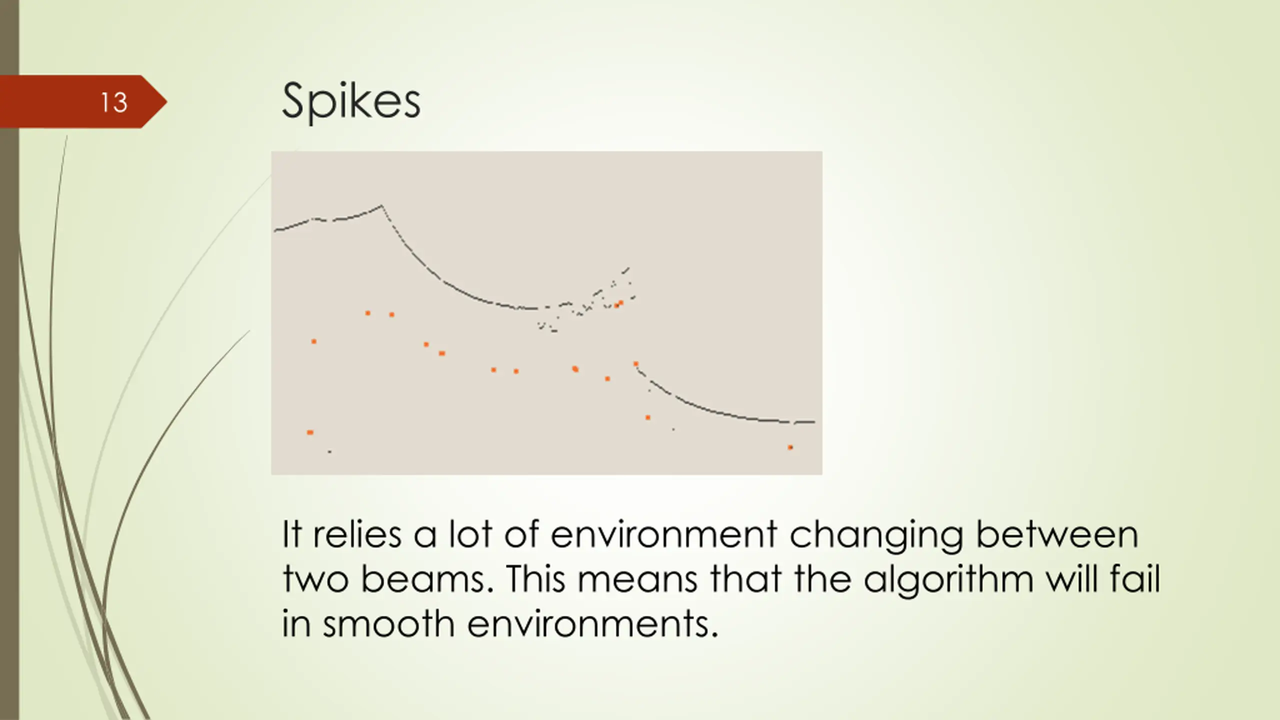 Spikes 13 It relies a lot of environment changing between two beams. This means that the algorithm will fail in smooth environments.