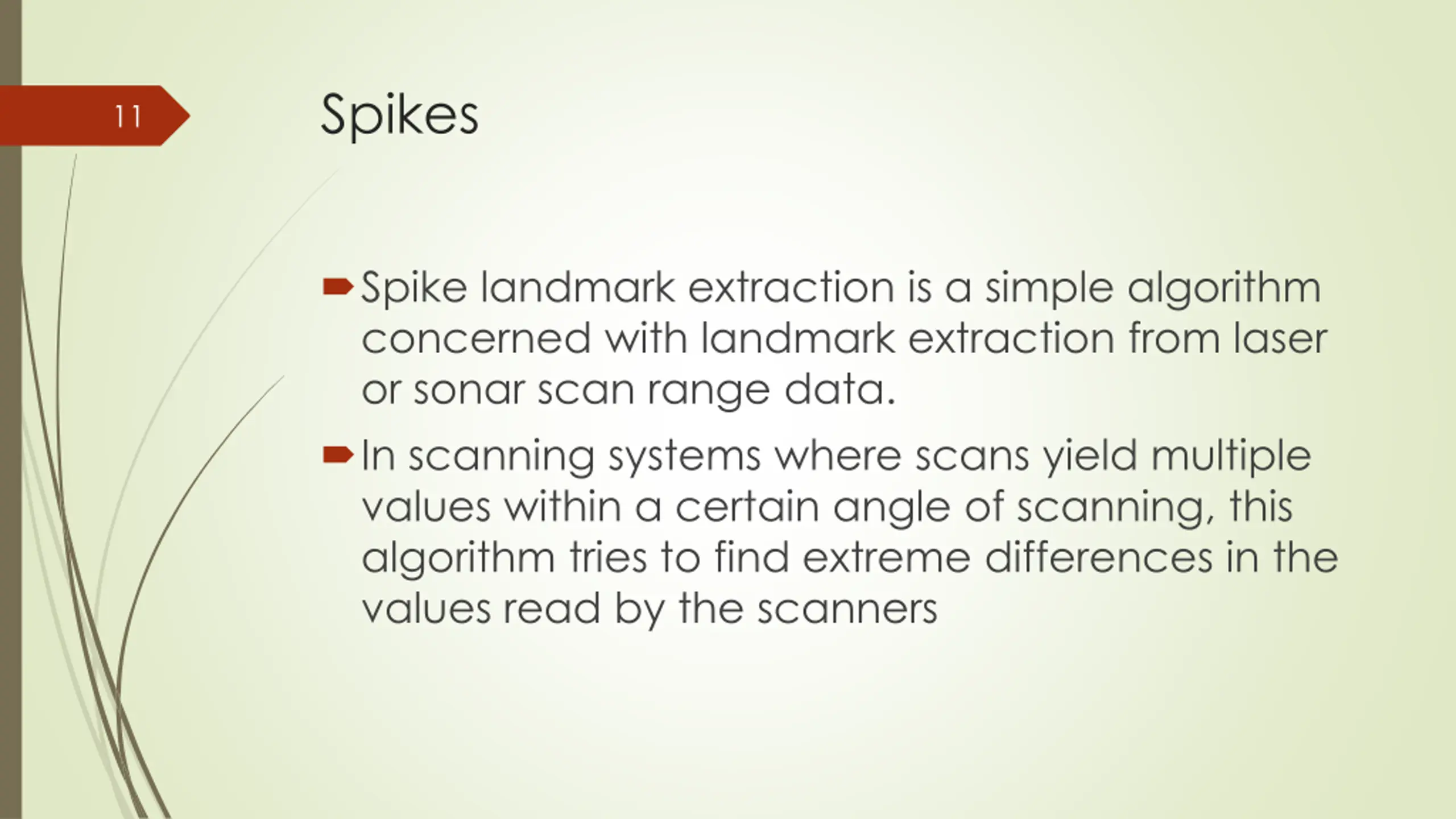 Spikes 11 Spike landmark extraction is a simple algorithm concerned with landmark extraction from laser or sonar scan range data. In scanning systems where scans yield multiple values within a certain angle of scanning, this algorithm tries to find extreme differences in the values read by the scanners