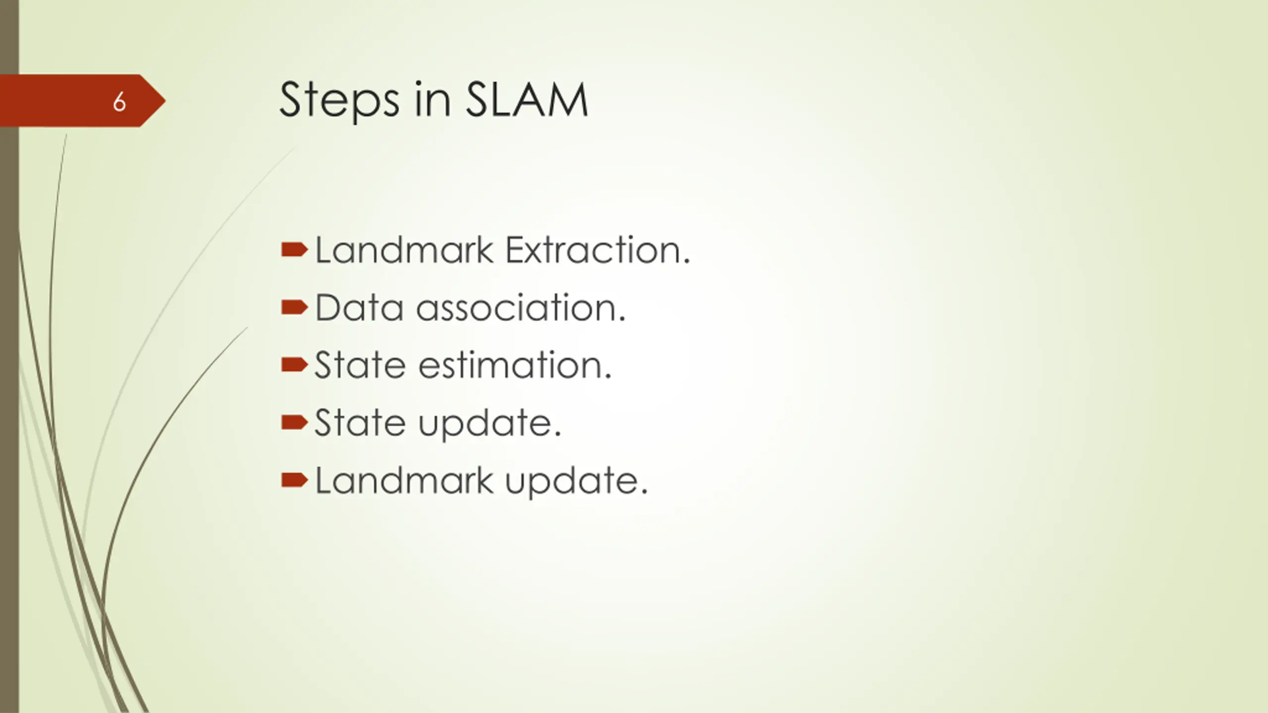 Steps in SLAM 6 Landmark Extraction. Data association. State estimation. State update. Landmark update.
