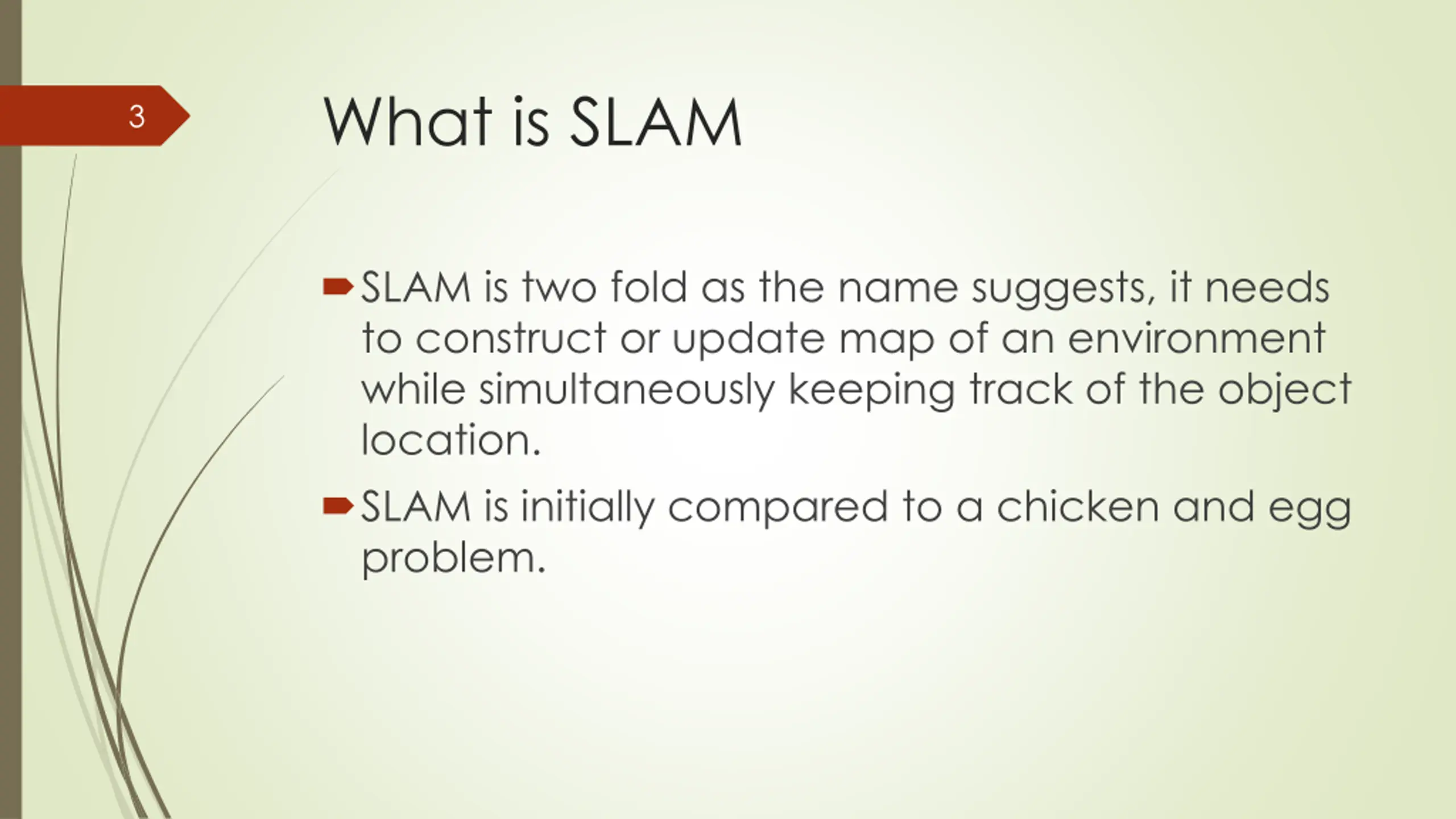 What is SLAM 3 SLAM is two fold as the name suggests, it needs to construct or update map of an environment while simultaneously keeping track of the object location. SLAM is initially compared to a chicken and egg problem.