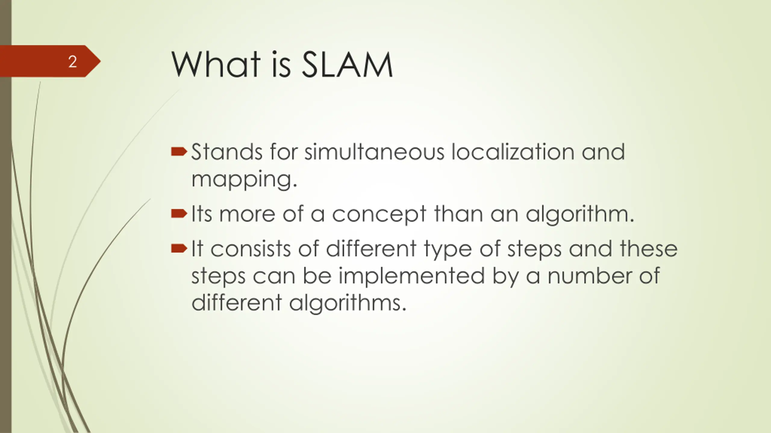 What is SLAM 2 Stands for simultaneous localization and mapping. Its more of a concept than an algorithm. It consists of different type of steps and these steps can be implemented by a number of different algorithms.