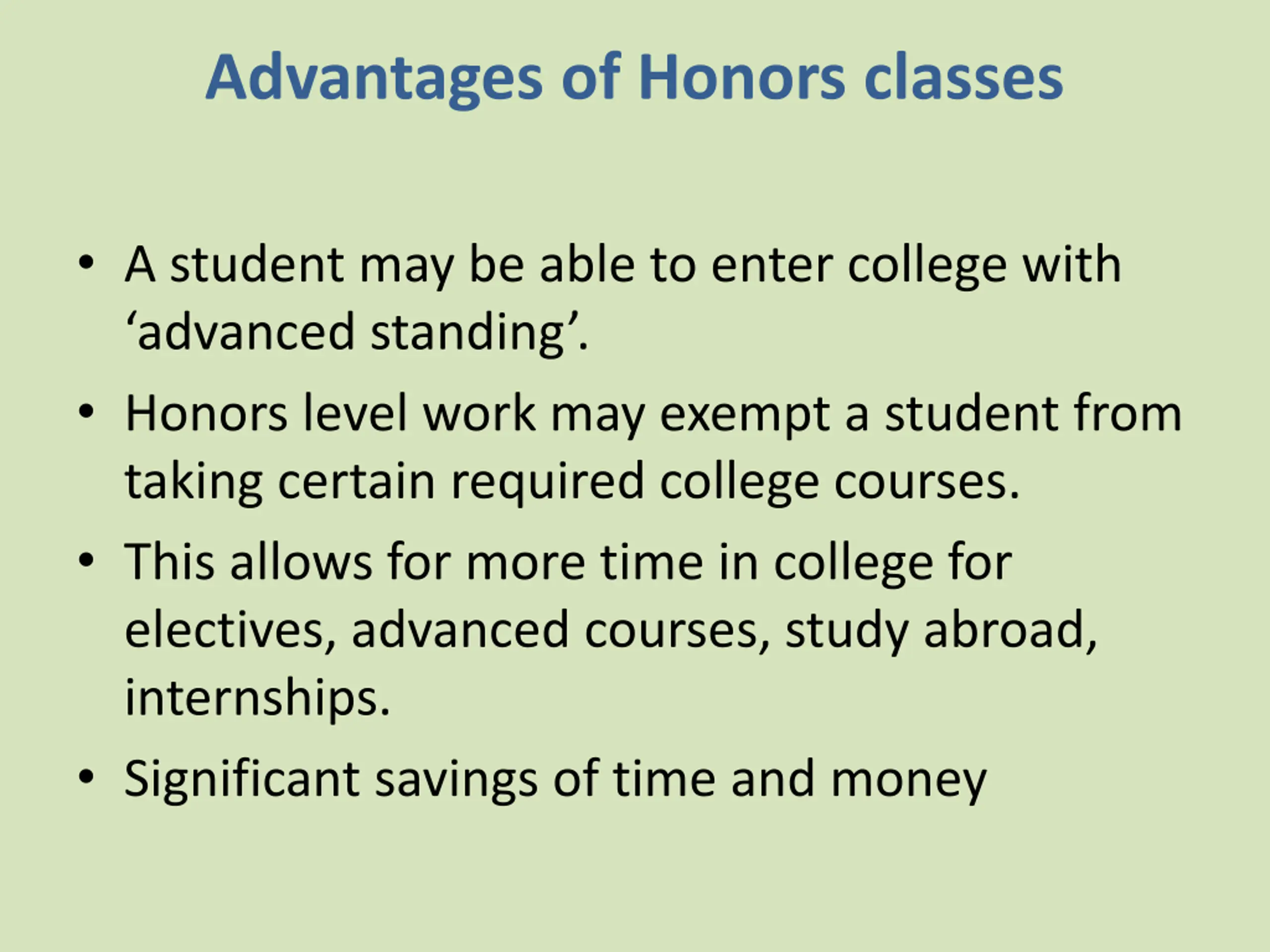 Advantages of Honors classes A student may be able to enter college with advanced standing . Honors level work may exempt a student from taking certain required college courses. This allows for more time in college for electives, advanced courses, study abroad, internships. Significant savings of time and money