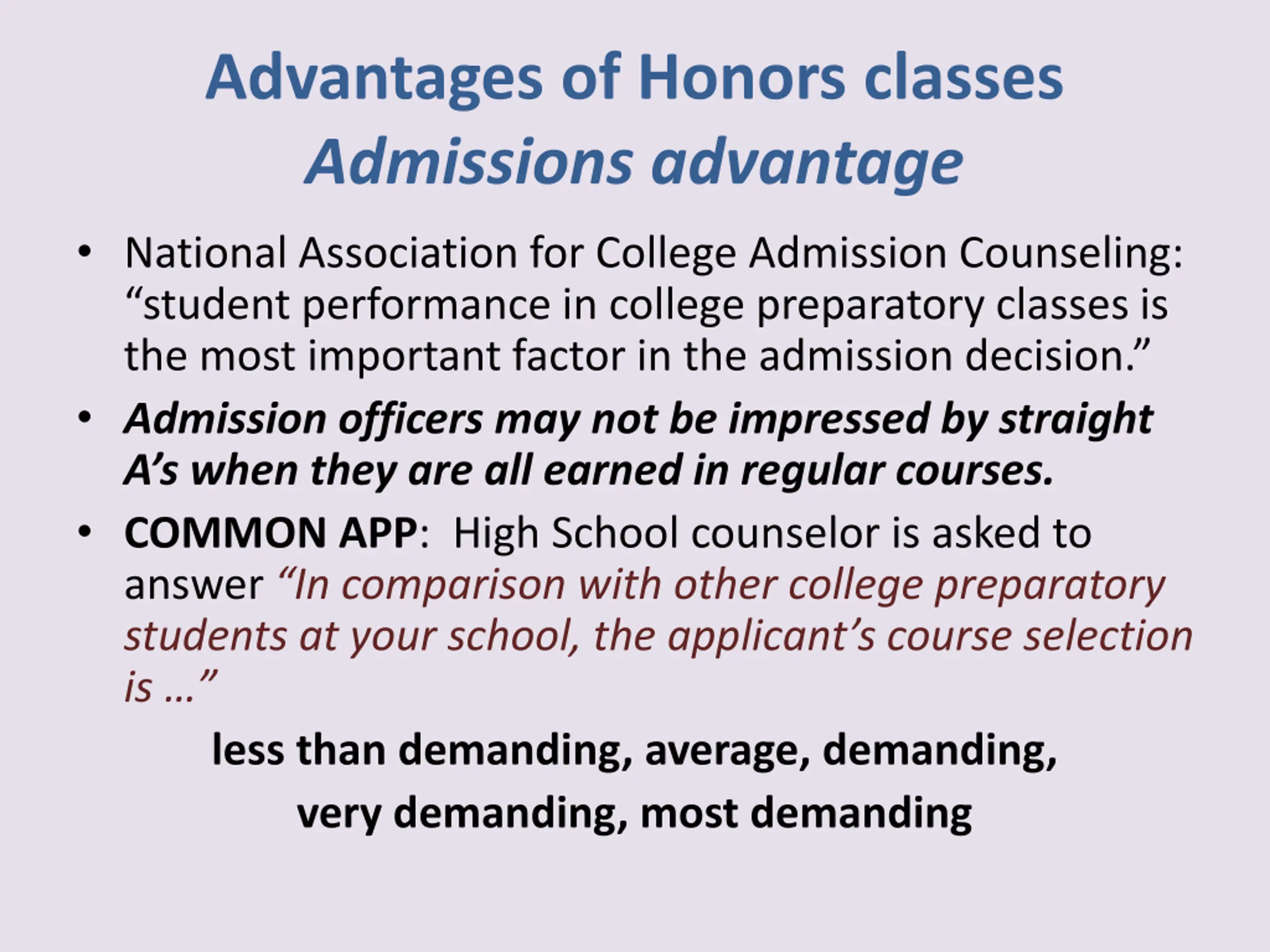Advantages of Honors classes Admissions advantage National Association for College Admission Counseling: student performance in college preparatory classes is the most important factor in the admission decision. Admission officers may not be impressed by straight A s when they are all earned in regular courses. COMMON APP: High School counselor is asked to answer In comparison with other college preparatory students at your school, the applicant s course selection is less than demanding, average, demanding, very demanding, most demanding