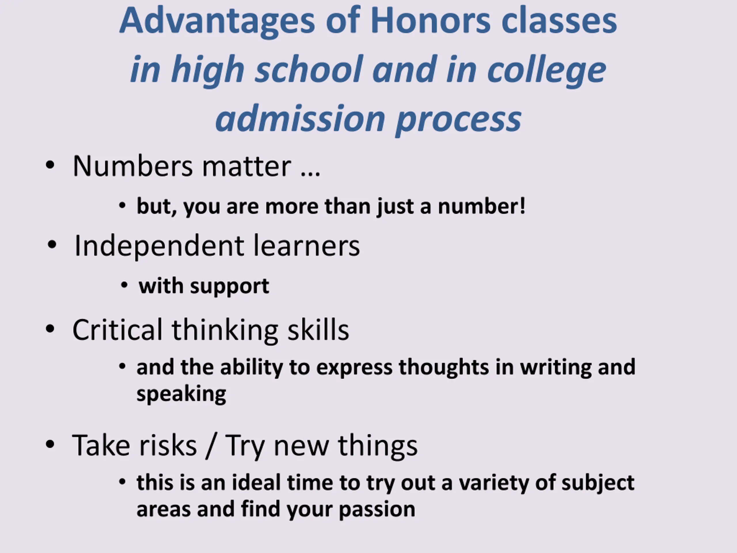 Advantages of Honors classes in high school and in college admission process Numbers matter but, you are more than just a number! Independent learners with support Critical thinking skills and the ability to express thoughts in writing and speaking Take risks / Try new things this is an ideal time to try out a variety of subject areas and find your passion