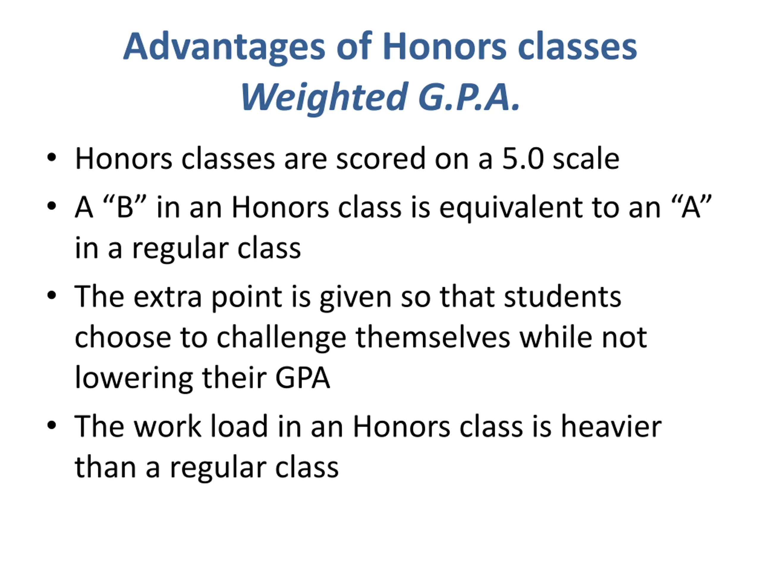 Advantages of Honors classes Weighted G.P.A. Honors classes are scored on a 5.0 scale A B in an Honors class is equivalent to an A in a regular class The extra point is given so that students choose to challenge themselves while not lowering their GPA The work load in an Honors class is heavier than a regular class