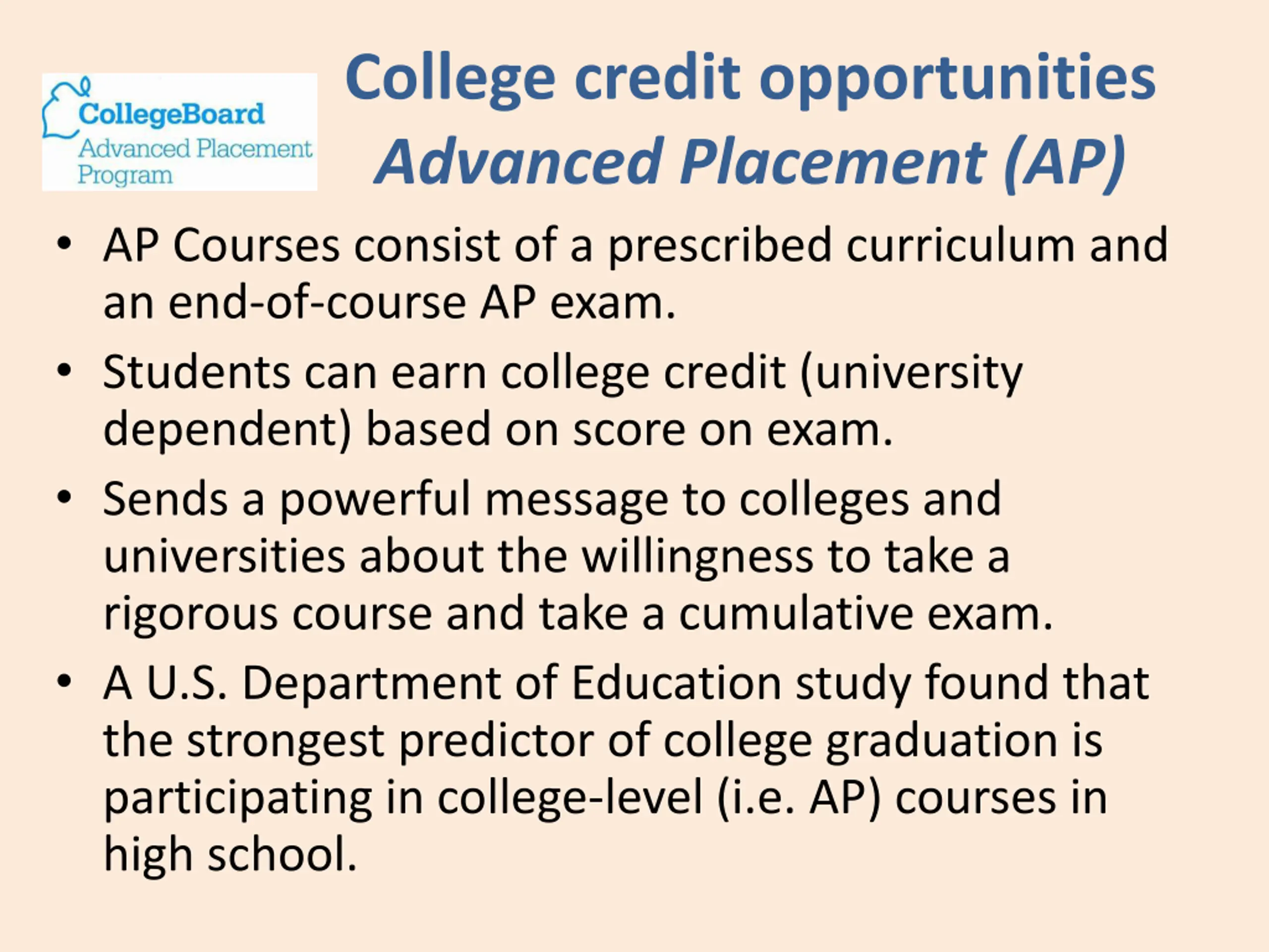College credit opportunities Advanced Placement (AP) AP Courses consist of a prescribed curriculum and an end-of-course AP exam. Students can earn college credit (university dependent) based on score on exam. Sends a powerful message to colleges and universities about the willingness to take a rigorous course and take a cumulative exam. A U.S. Department of Education study found that the strongest predictor of college graduation is participating in college-level (i.e. AP) courses in high school.