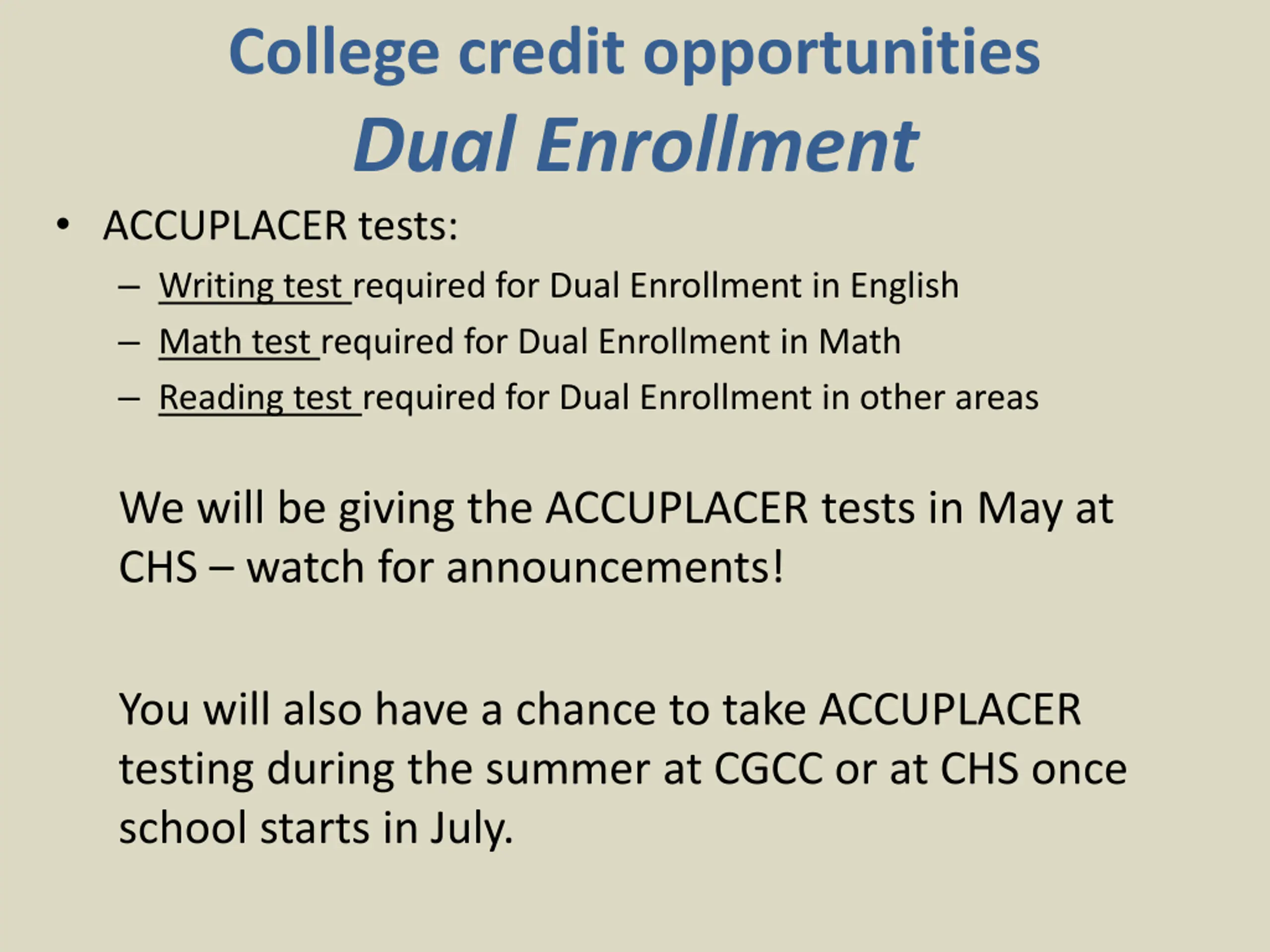 College credit opportunities Dual Enrollment ACCUPLACER tests: Writing test required for Dual Enrollment in English Math test required for Dual Enrollment in Math Reading test required for Dual Enrollment in other areas We will be giving the ACCUPLACER tests in May at CHS watch for announcements! You will also have a chance to take ACCUPLACER testing during the summer at CGCC or at CHS once school starts in July.