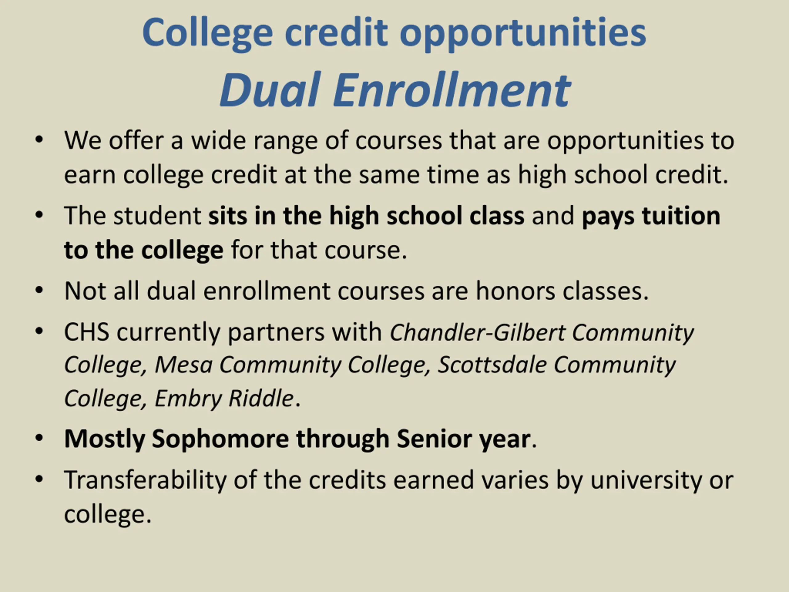 College credit opportunities Dual Enrollment We offer a wide range of courses that are opportunities to earn college credit at the same time as high school credit. The student sits in the high school class and pays tuition to the college for that course. Not all dual enrollment courses are honors classes. CHS currently partners with Chandler-Gilbert Community College, Mesa Community College, Scottsdale Community College, Embry Riddle. Mostly Sophomore through Senior year. Transferability of the credits earned varies by university or college.
