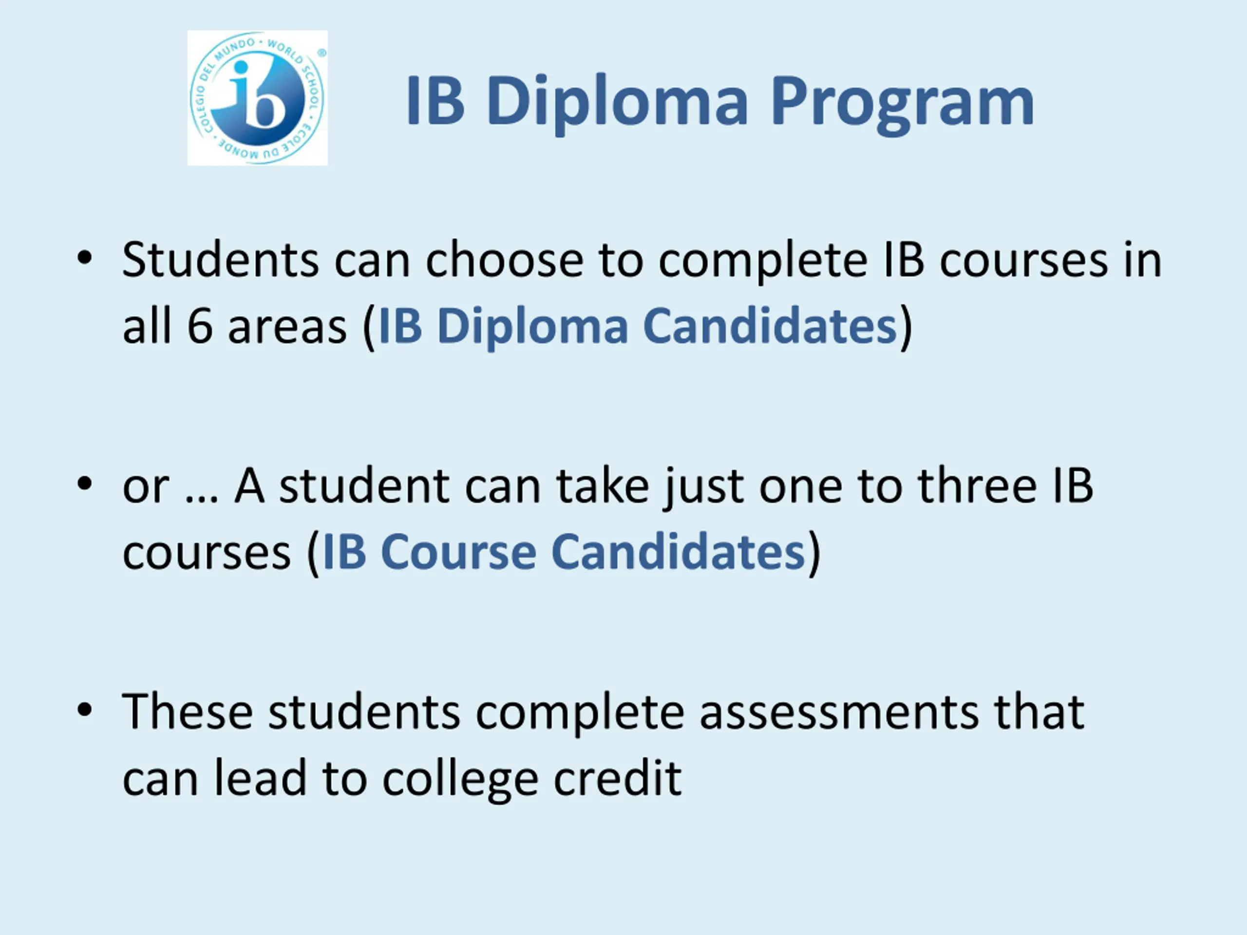 IB Diploma Program Students can choose to complete IB courses in all 6 areas (IB Diploma Candidates) or A student can take just one to three IB courses (IB Course Candidates) These students complete assessments that can lead to college credit