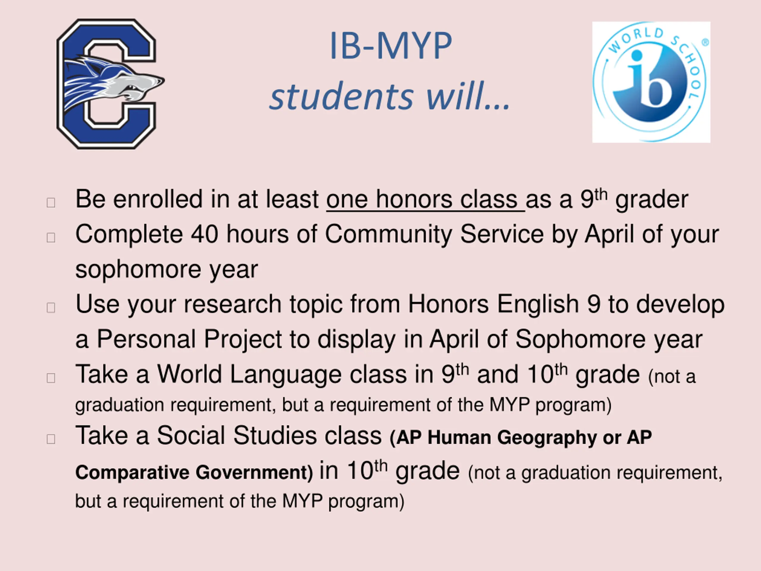 IB-MYP students will Be enrolled in at least one honors class as a 9th grader Complete 40 hours of Community Service by April of your sophomore year Use your research topic from Honors English 9 to develop a Personal Project to display in April of Sophomore year Take a World Language class in 9th and 10th grade (not a graduation requirement, but a requirement of the MYP program) Take a Social Studies class (AP Human Geography or AP Comparative Government)in 10th grade (not a graduation requirement, but a requirement of the MYP program)