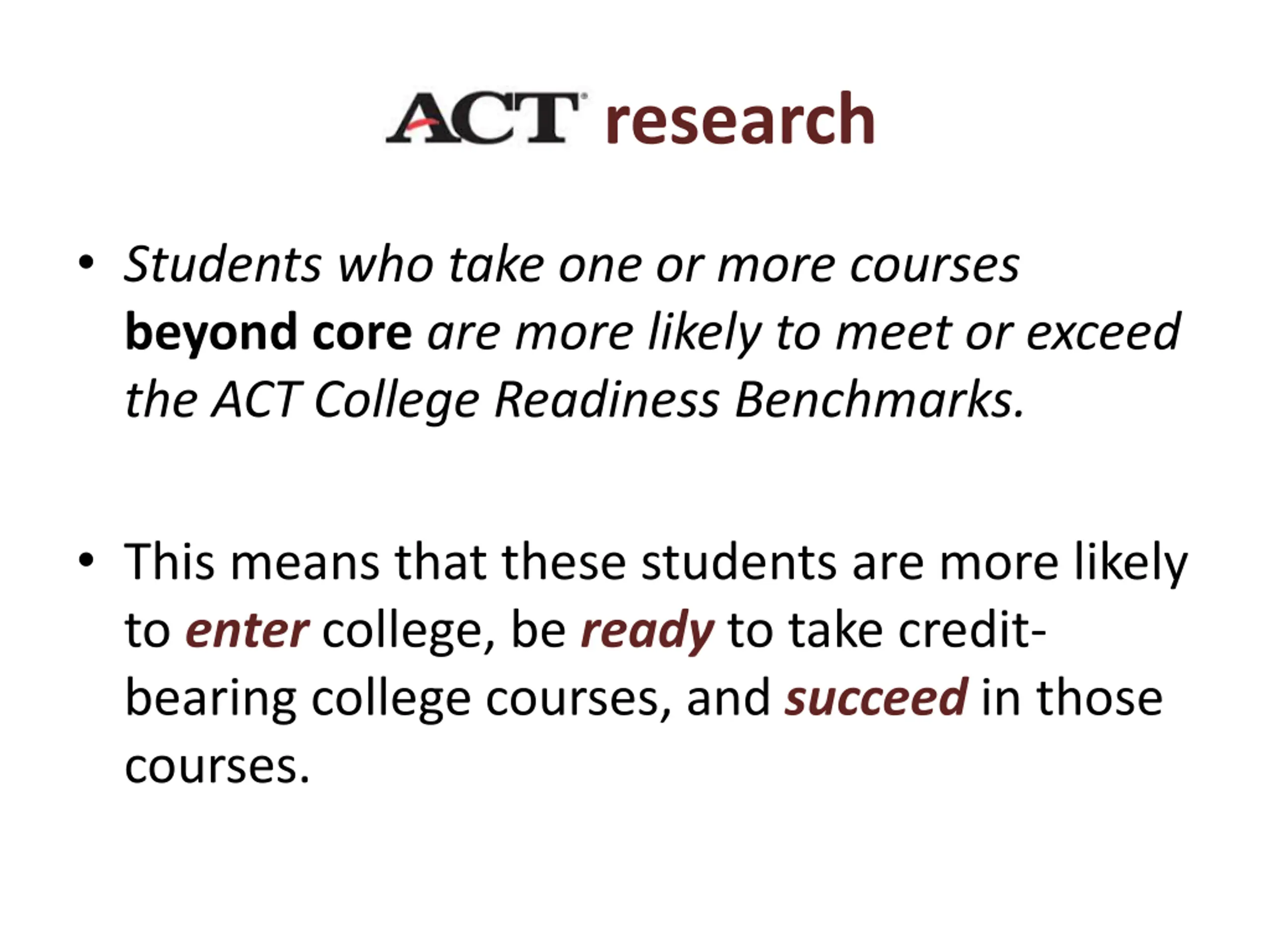 research Students who take one or more courses beyond core are more likely to meet or exceed the ACT College Readiness Benchmarks. This means that these students are more likely to enter college, be ready to take credit- bearing college courses, and succeed in those courses.