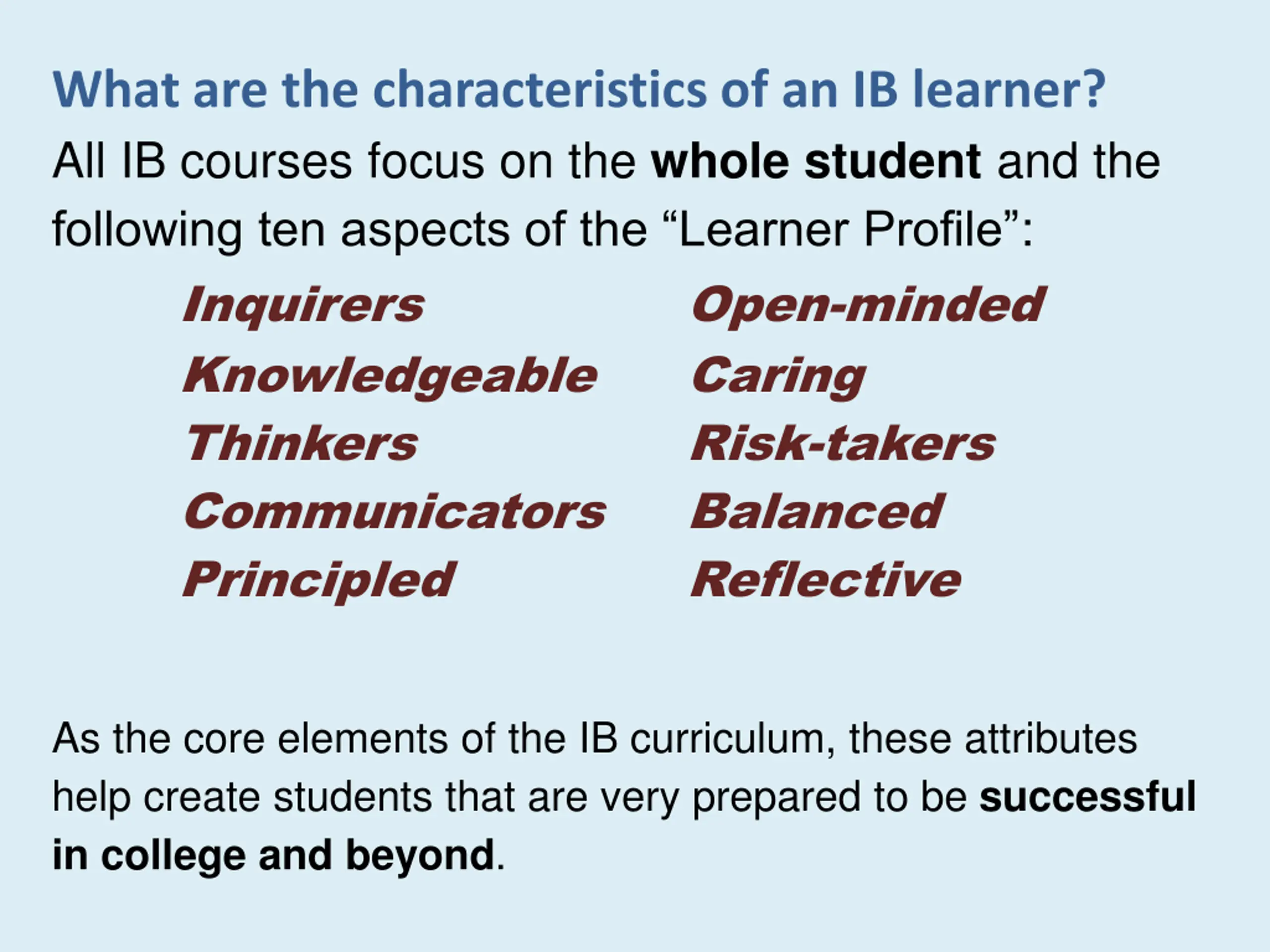 What are the characteristics of an IB learner? All IB courses focus on the whole student and the following ten aspects of the Learner Profile : Inquirers Knowledgeable Thinkers Communicators Principled Open-minded Caring Risk-takers Balanced Reflective As the core elements of the IB curriculum, these attributes help create students that are very prepared to be successful in college and beyond.