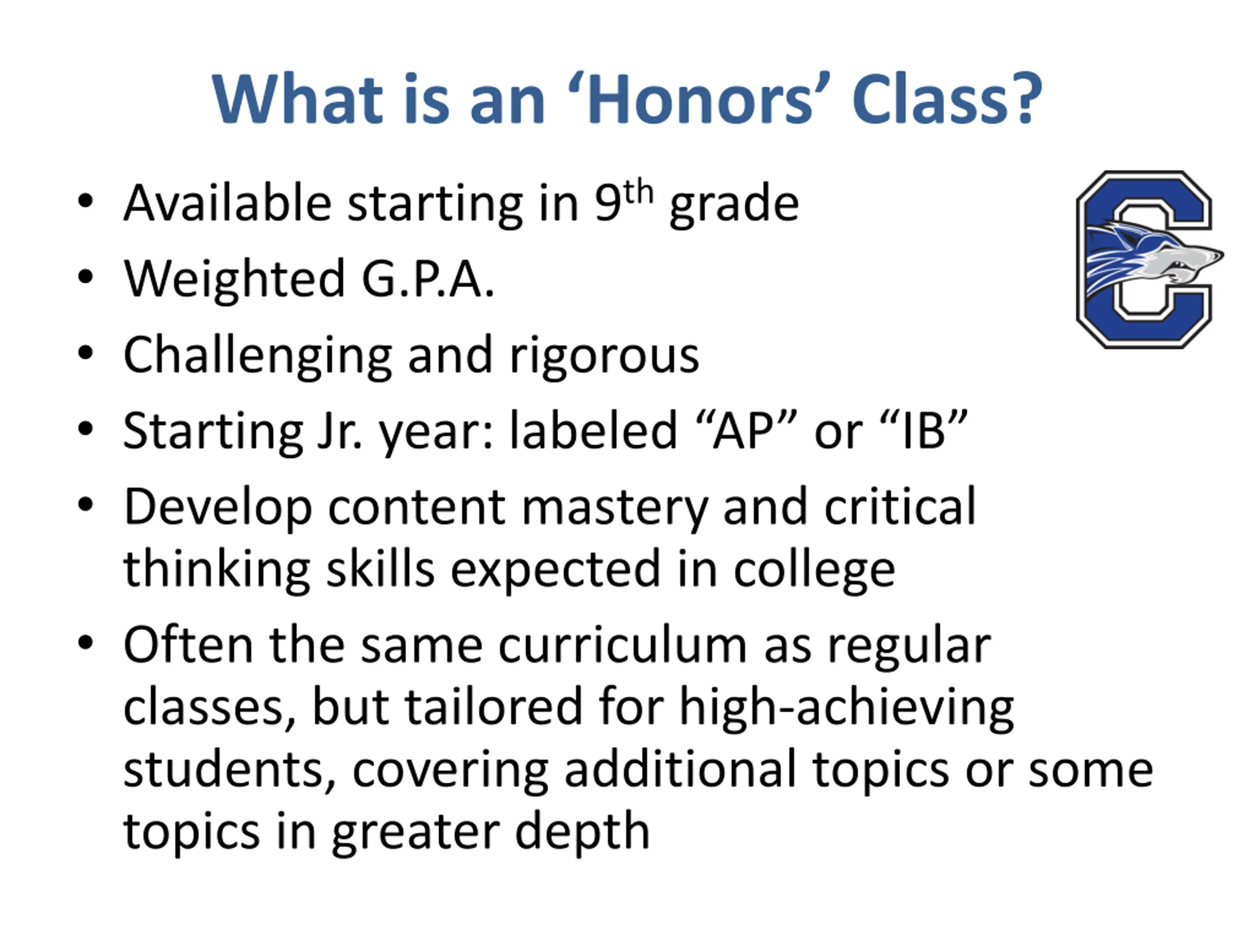 What is an Honors Class? Available starting in 9th grade Weighted G.P.A. Challenging and rigorous Starting Jr. year: labeled AP or IB Develop content mastery and critical thinking skills expected in college Often the same curriculum as regular classes, but tailored for high-achieving students, covering additional topics or some topics in greater depth