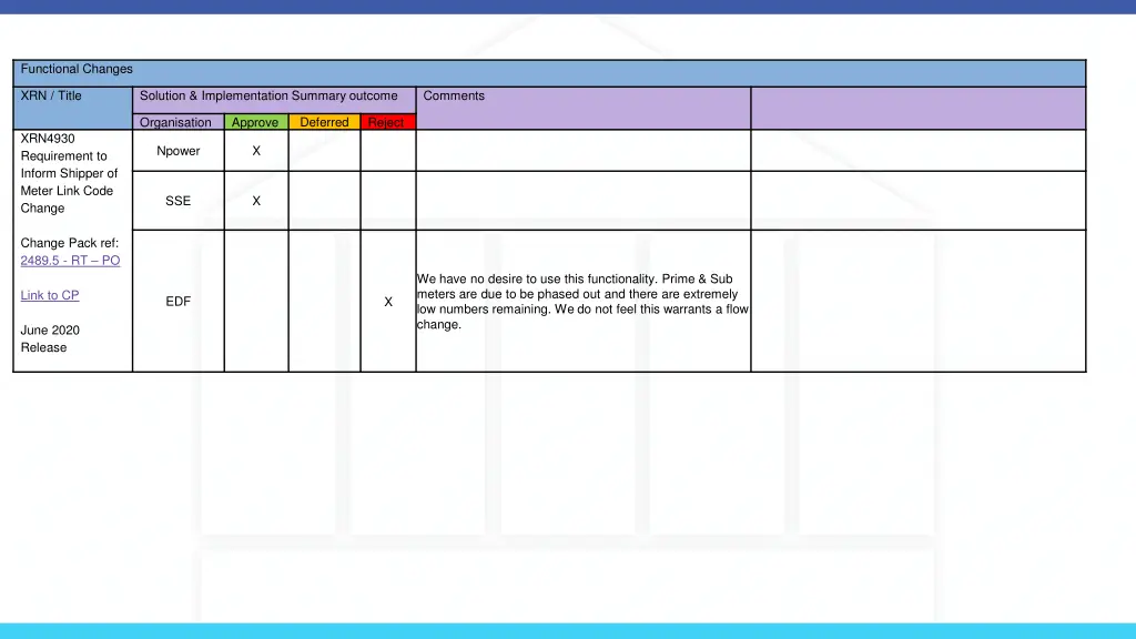 Functional Changes XRN / Title Solution & Implementation Summary outcome Comments Deferred Organisation Approve Reject XRN4930 Requirement to Inform Shipper of Meter Link Code Change Npower X SSE X Change Pack ref: 2489.5 - RT PO We have no desire to use this functionality. Prime & Sub meters are due to be phased out and there are extremely low numbers remaining. We do not feel this warrants a flow change. Link to CP EDF X June 2020 Release