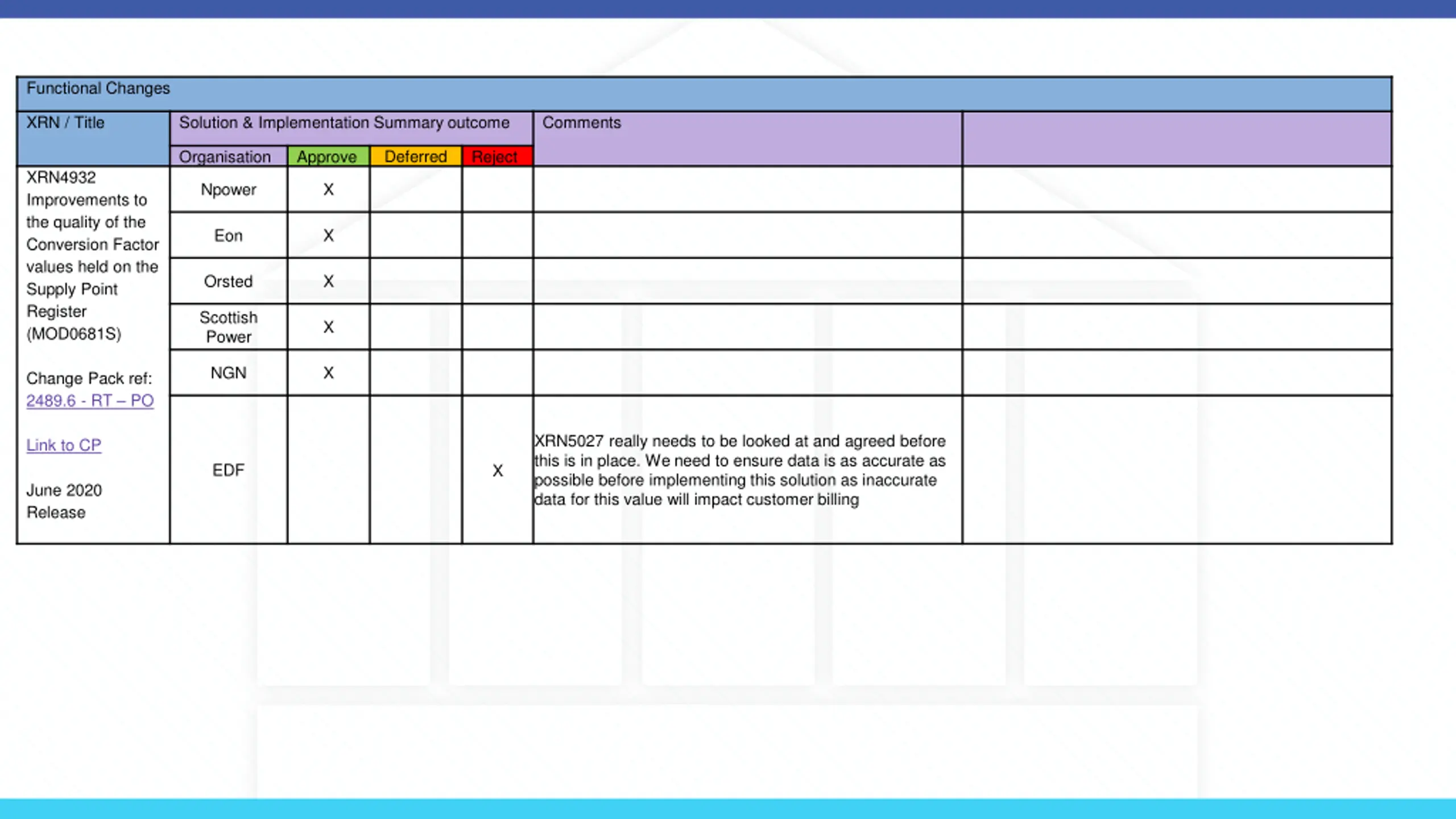 Functional Changes XRN / Title Solution & Implementation Summary outcome Comments Deferred Organisation Approve Reject XRN4932 Improvements to the quality of the Conversion Factor values held on the Supply Point Register (MOD0681S) Npower X Eon X Orsted X Scottish Power X NGN X Change Pack ref: 2489.6 - RT PO XRN5027 really needs to be looked at and agreed before this is in place. We need to ensure data is as accurate as possible before implementing this solution as inaccurate data for this value will impact customer billing Link to CP EDF X June 2020 Release