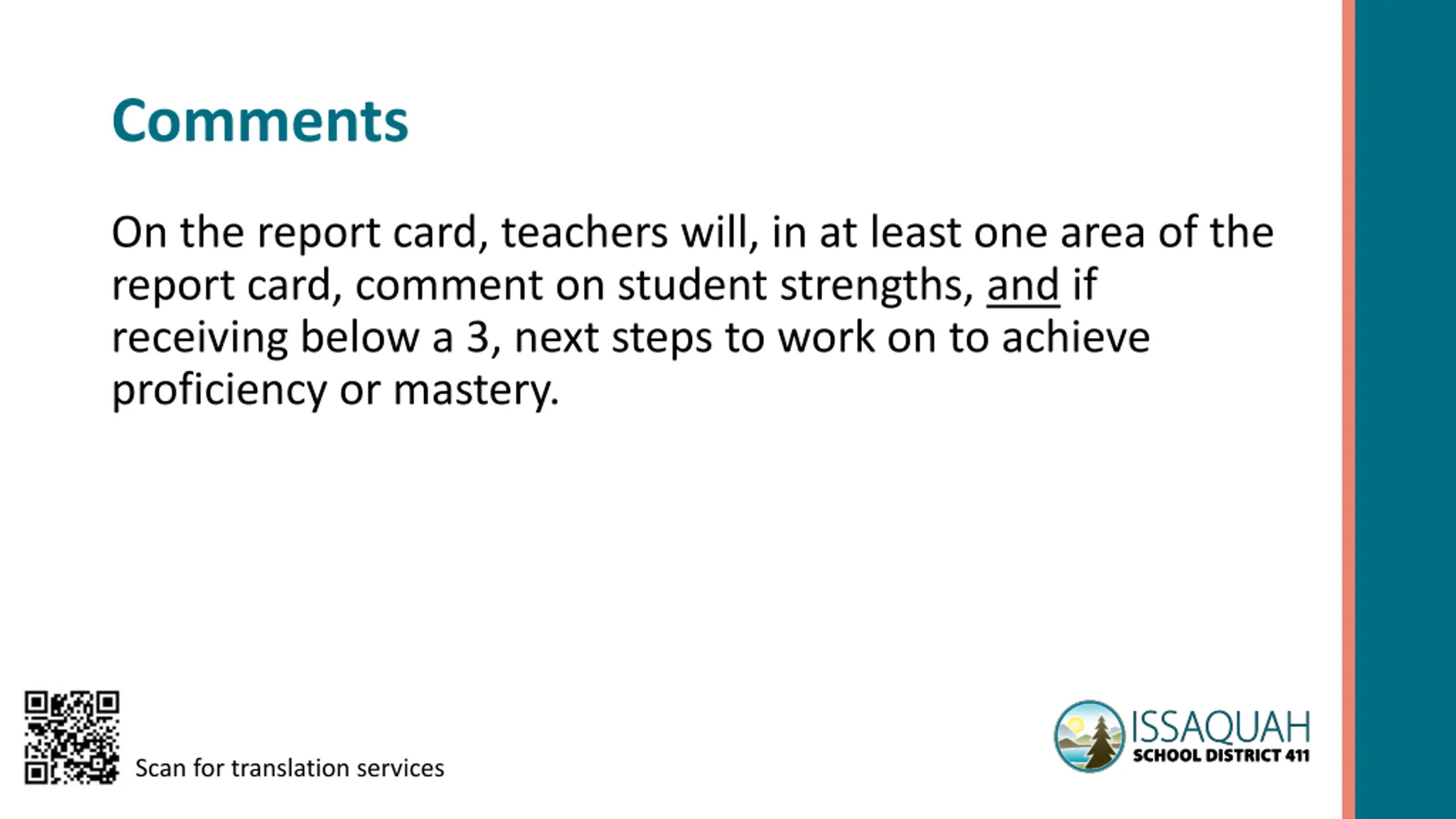 Comments On the report card, teachers will, in at least one area of the report card, comment on student strengths, and if receiving below a 3, next steps to work on to achieve proficiency or mastery. Scan for translation services