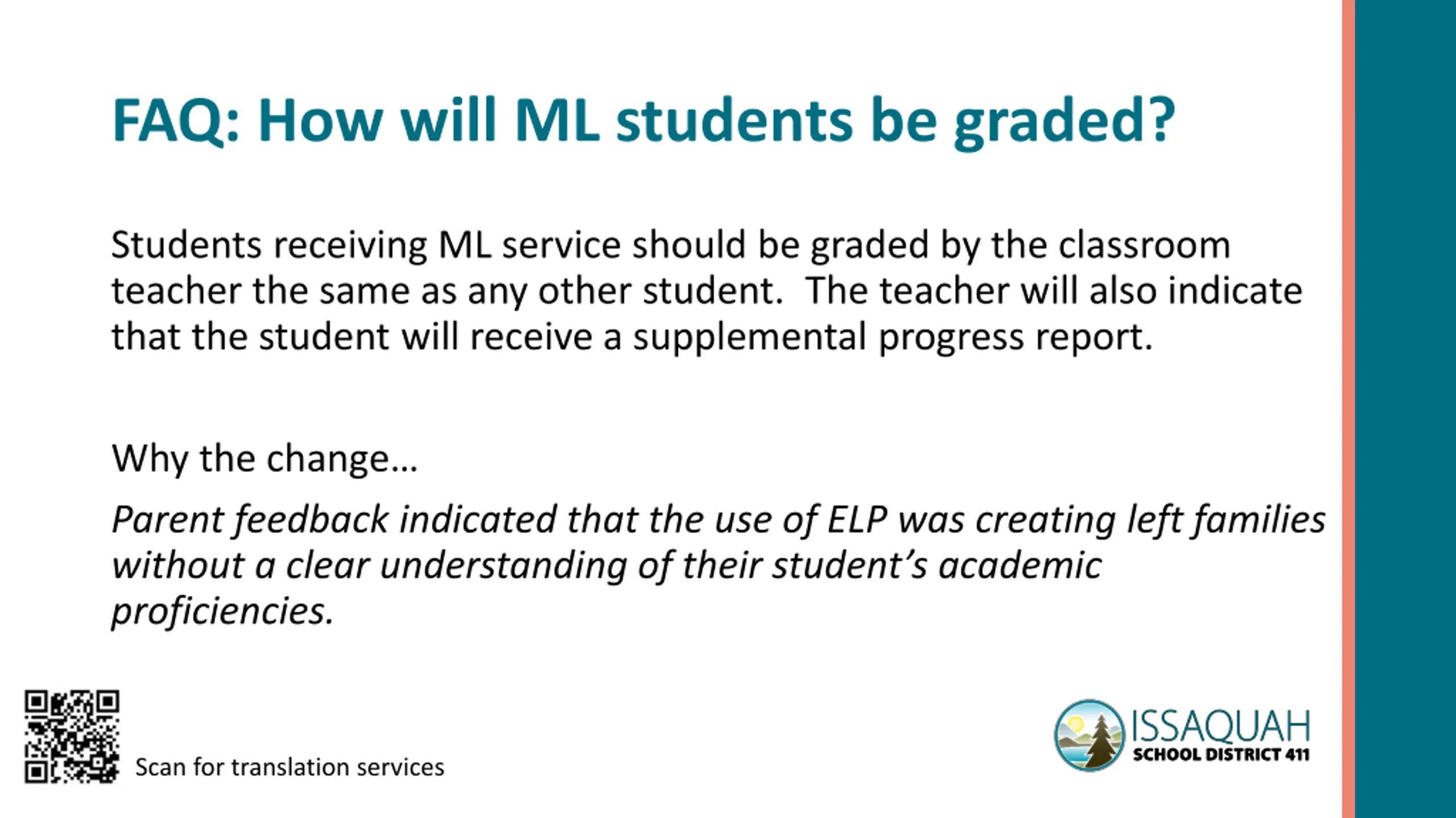 FAQ: How will ML students be graded? Students receiving ML service should be graded by the classroom teacher the same as any other student. The teacher will also indicate that the student will receive a supplemental progress report. Why the change Parent feedback indicated that the use of ELP was creating left families without a clear understanding of their student s academic proficiencies. Scan for translation services