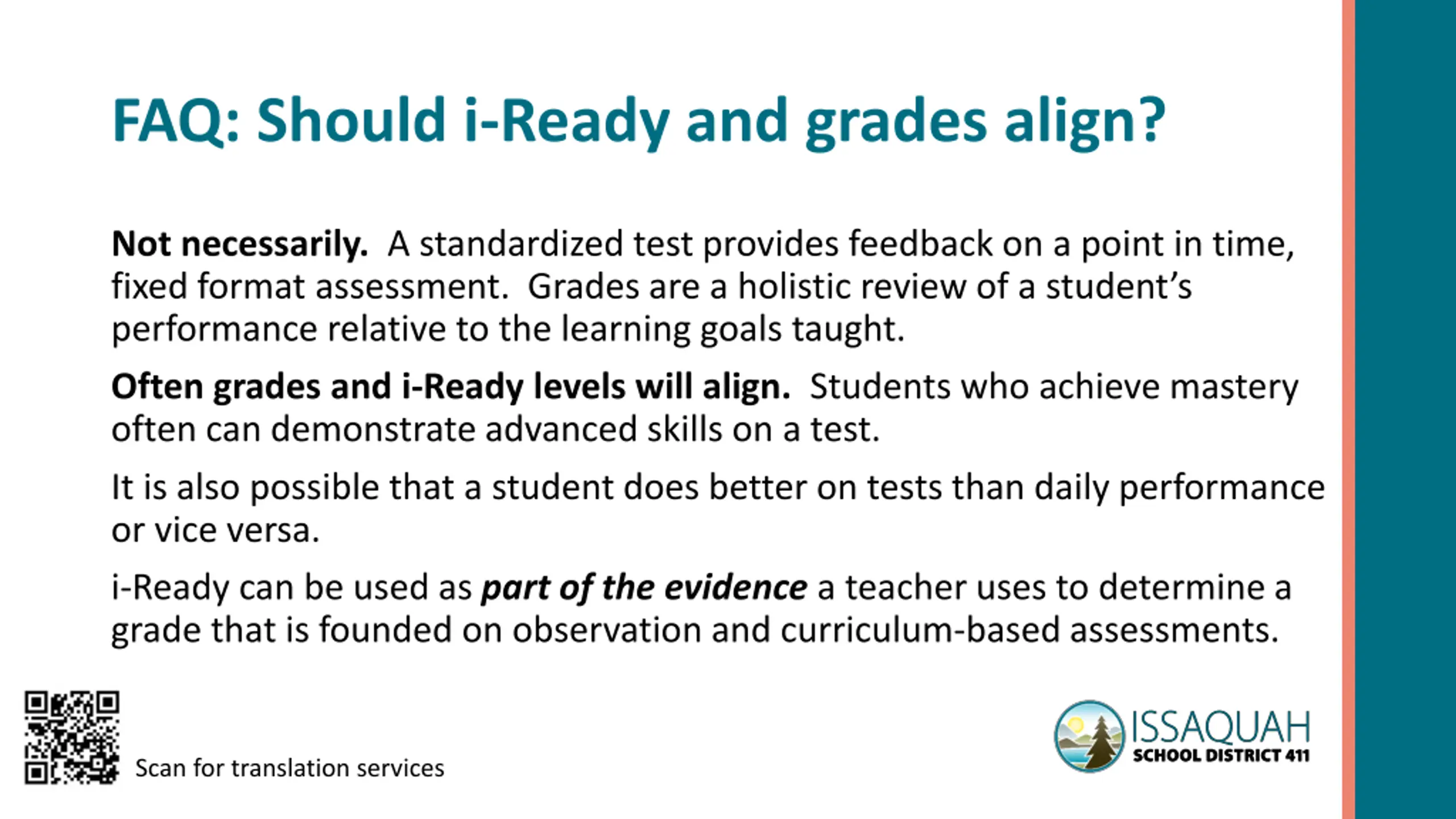 FAQ: Should i-Ready and grades align? Not necessarily. A standardized test provides feedback on a point in time, fixed format assessment. Grades are a holistic review of a student s performance relative to the learning goals taught. Often grades and i-Ready levels will align. Students who achieve mastery often can demonstrate advanced skills on a test. It is also possible that a student does better on tests than daily performance or vice versa. i-Ready can be used as part of the evidence a teacher uses to determine a grade that is founded on observation and curriculum-based assessments. Scan for translation services