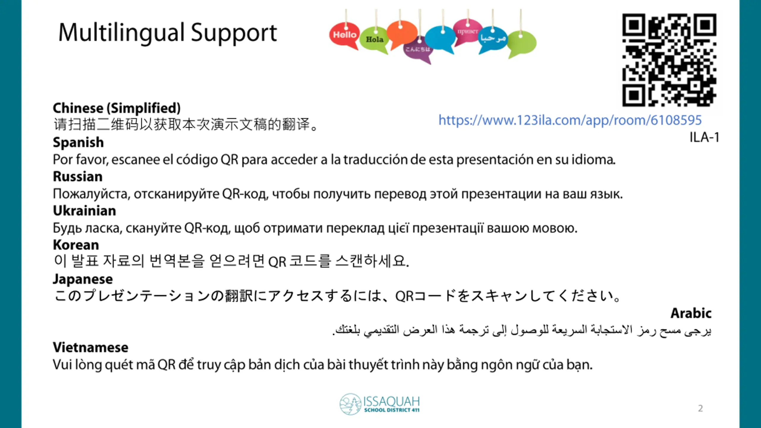 Updated to reflect presentation Jan 25, 2025 FAQ: The 4 used to be called Above Standard, how does that compare to Mastery? The language Above Standard led to confusion, it did not match our curriculum-based assessments. Mastery more accurately describes how we teach to high levels of learning that extend beyond 3 or meeting standard / proficient. Students who demonstrate mastery of learning expectations in our curriculum are showing high levels of achievement. Washington state is also clarifying what the 4 means in our standards. OSPI is now calling the 4 advanced, meaning advanced understanding of grade level standards. Their definition of advanced is the same as our definition of mastery. i-Ready testing shows that students who demonstrate mastery of our curriculum are typically able to apply their learning to above grade level tasks. Even so, our grading is based on their performance on our curriculum-based assessments of grade-level standards. Scan for translation services