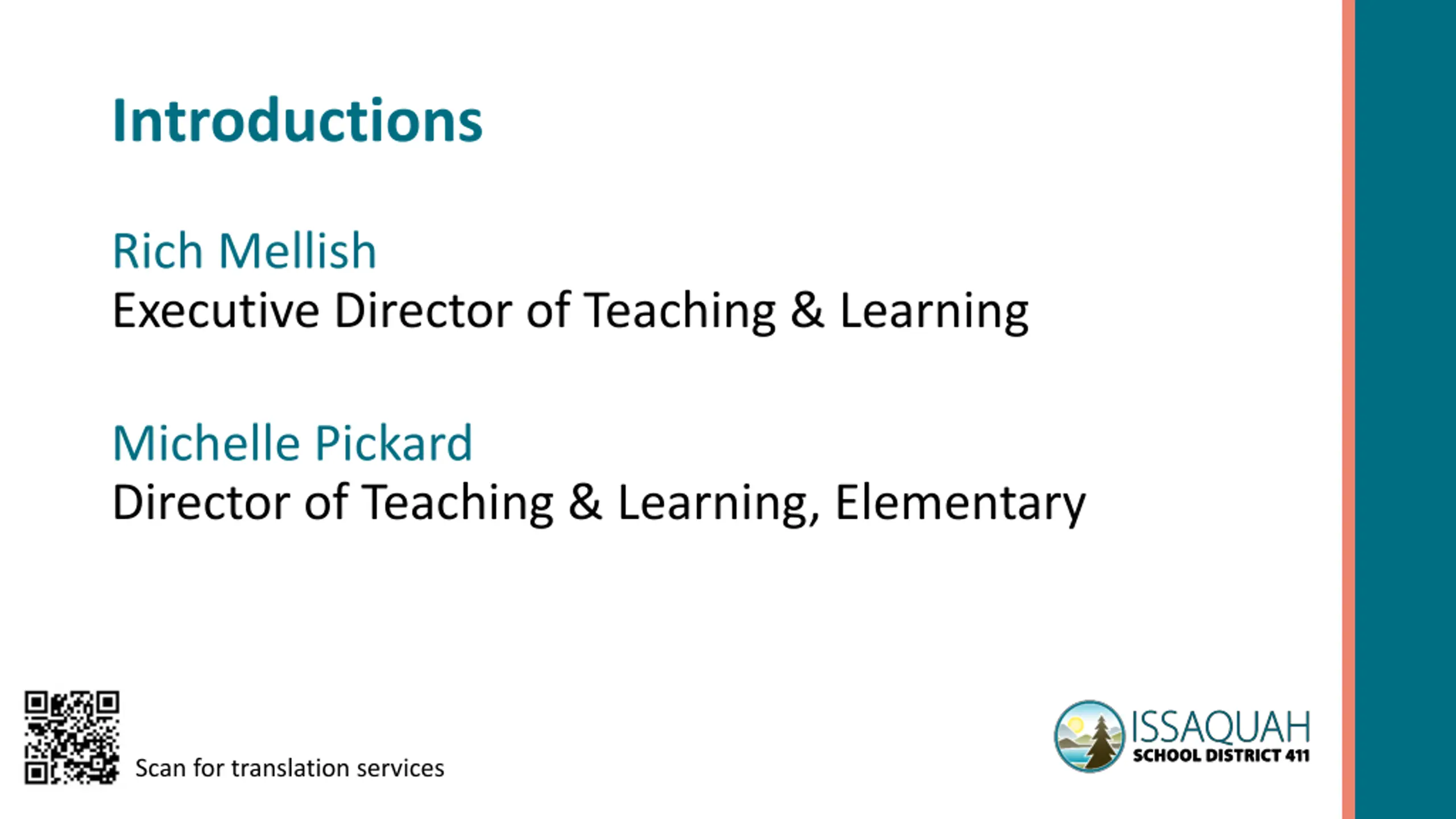Introductions Rich Mellish Executive Director of Teaching & Learning Michelle Pickard Director of Teaching & Learning, Elementary Scan for translation services