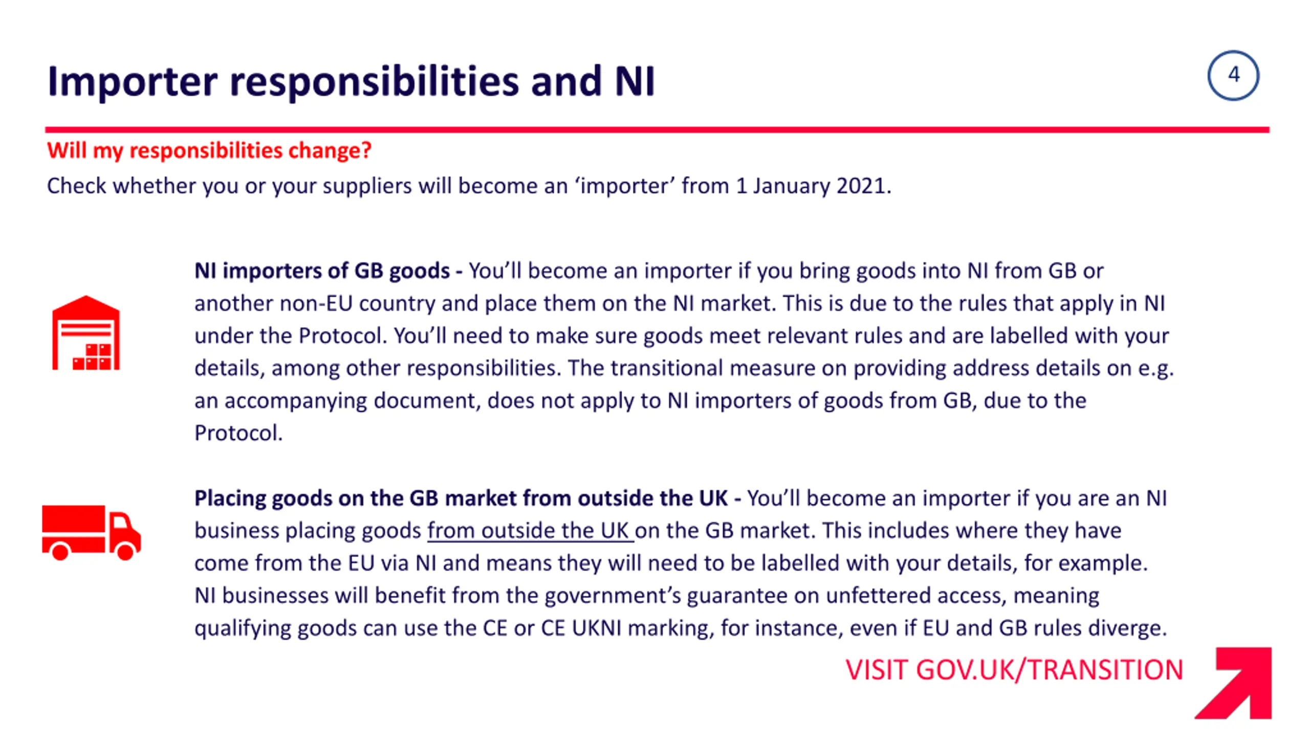 Importer responsibilities and NI 4 Will my responsibilities change? Check whether you or your suppliers will become an importer from 1 January 2021. NI importers of GB goods - You ll become an importer if you bring goods into NI from GB or another non-EU country and place them on the NI market. This is due to the rules that apply in NI under the Protocol. You ll need to make sure goods meet relevant rules and are labelled with your details, among other responsibilities. The transitional measure on providing address details on e.g. an accompanying document, does not apply to NI importers of goods from GB, due to the Protocol. Placing goods on the GB market from outside the UK - You ll become an importer if you are an NI business placing goods from outside the UK on the GB market. This includes where they have come from the EU via NI and means they will need to be labelled with your details, for example. NI businesses will benefit from the government s guarantee on unfettered access, meaning qualifying goods can use the CE or CE UKNI marking, for instance, even if EU and GB rules diverge. VISIT GOV.UK/TRANSITION