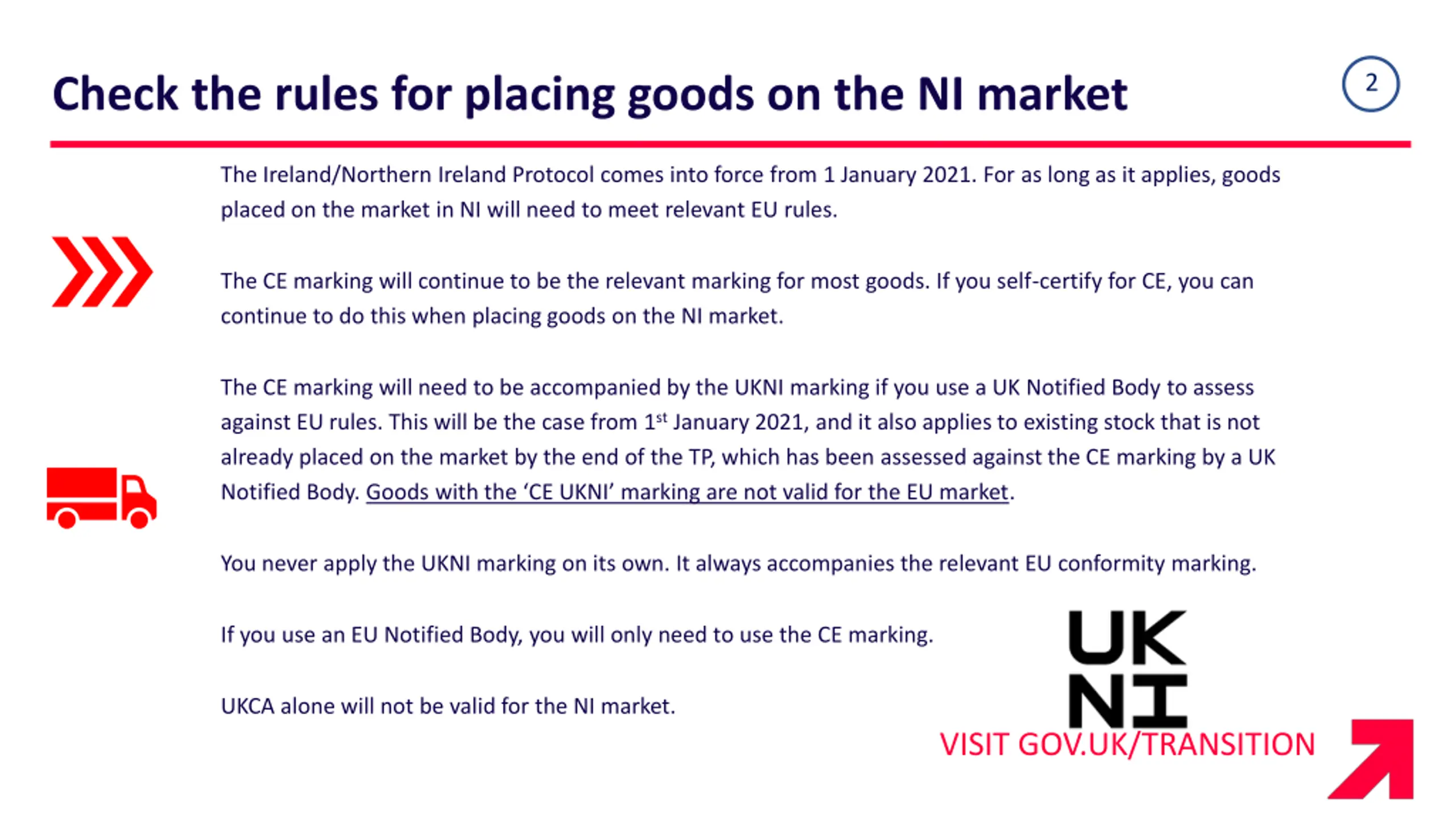 2 Check the rules for placing goods on the NI market The Ireland/Northern Ireland Protocol comes into force from 1 January 2021. For as long as it applies, goods placed on the market in NI will need to meet relevant EU rules. The CE marking will continue to be the relevant marking for most goods. If you self-certify for CE, you can continue to do this when placing goods on the NI market. The CE marking will need to be accompanied by the UKNI marking if you use a UK Notified Body to assess against EU rules. This will be the case from 1st January 2021, and it also applies to existing stock that is not already placed on the market by the end of the TP, which has been assessed against the CE marking by a UK Notified Body. Goods with the CE UKNI marking are not valid for the EU market. You never apply the UKNI marking on its own. It always accompanies the relevant EU conformity marking. If you use an EU Notified Body, you will only need to use the CE marking. UKCA alone will not be valid for the NI market. VISIT GOV.UK/TRANSITION