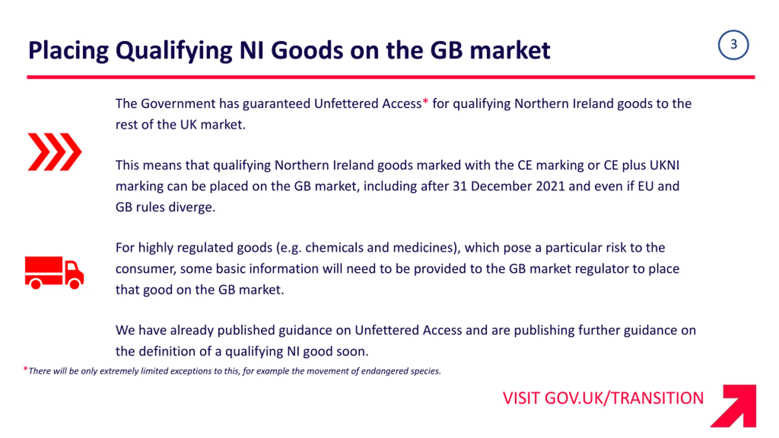 3 Placing Qualifying NI Goods on the GB market The Government has guaranteed Unfettered Access* for qualifying Northern Ireland goods to the rest of the UK market. This means that qualifying Northern Ireland goods marked with the CE marking or CE plus UKNI marking can be placed on the GB market, including after 31 December 2021 and even if EU and GB rules diverge. For highly regulated goods (e.g. chemicals and medicines), which pose a particular risk to the consumer, some basic information will need to be provided to the GB market regulator to place that good on the GB market. We have already published guidance on Unfettered Access and are publishing further guidance on the definition of a qualifying NI good soon. *There will be only extremely limited exceptions to this, for example the movement of endangered species. VISIT GOV.UK/TRANSITION