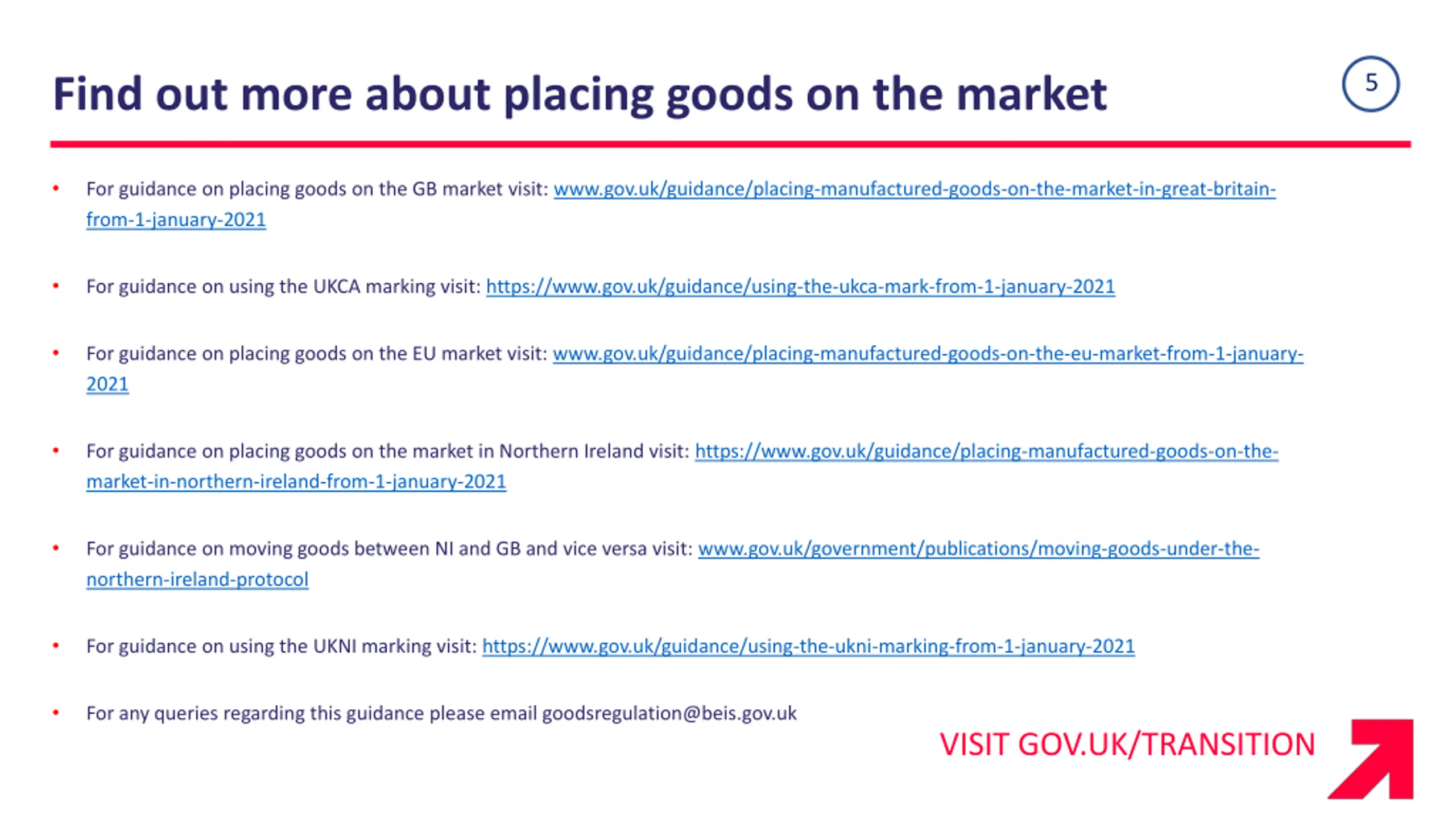 5 Find out more about placing goods on the market For guidance on placing goods on the GB market visit: www.gov.uk/guidance/placing-manufactured-goods-on-the-market-in-great-britain- from-1-january-2021 For guidance on using the UKCA marking visit: https://www.gov.uk/guidance/using-the-ukca-mark-from-1-january-2021 For guidance on placing goods on the EU market visit: www.gov.uk/guidance/placing-manufactured-goods-on-the-eu-market-from-1-january- 2021 For guidance on placing goods on the market in Northern Ireland visit: https://www.gov.uk/guidance/placing-manufactured-goods-on-the- market-in-northern-ireland-from-1-january-2021 For guidance on moving goods between NI and GB and vice versa visit: www.gov.uk/government/publications/moving-goods-under-the- northern-ireland-protocol For guidance on using the UKNI marking visit: https://www.gov.uk/guidance/using-the-ukni-marking-from-1-january-2021 For any queries regarding this guidance please email goodsregulation@beis.gov.uk VISIT GOV.UK/TRANSITION